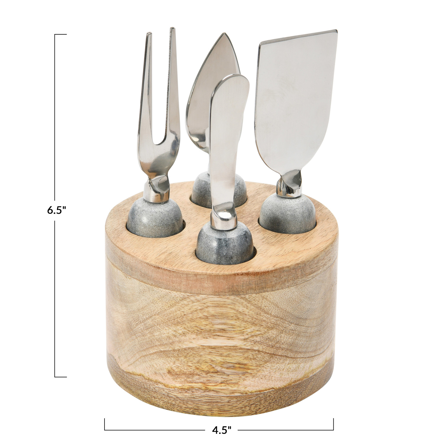 Catalog Name: 4-1/2" Round x 6-1/2"H Stainless Steel Cheese Servers w/ Marble Handles & Mango Wood Stand, Grey & Natural, Set of 5