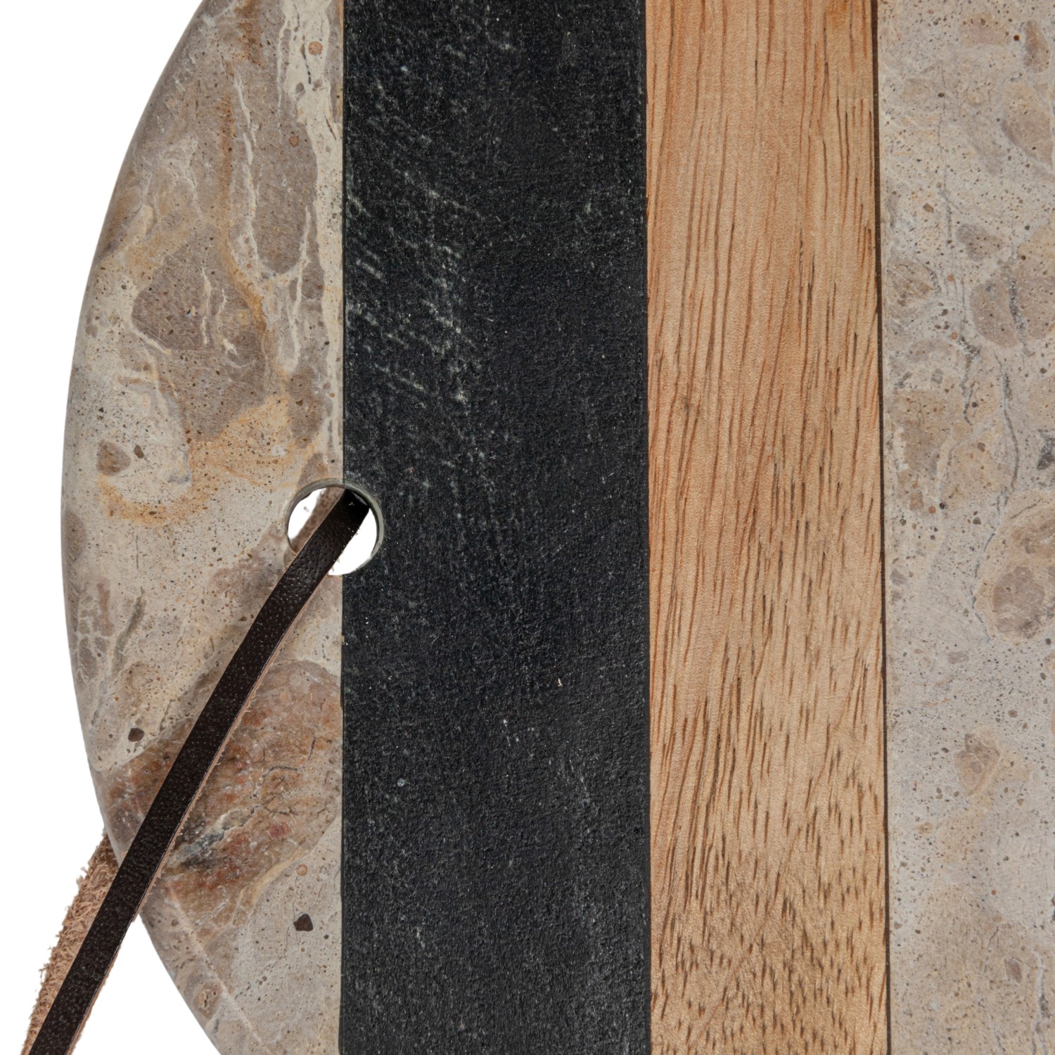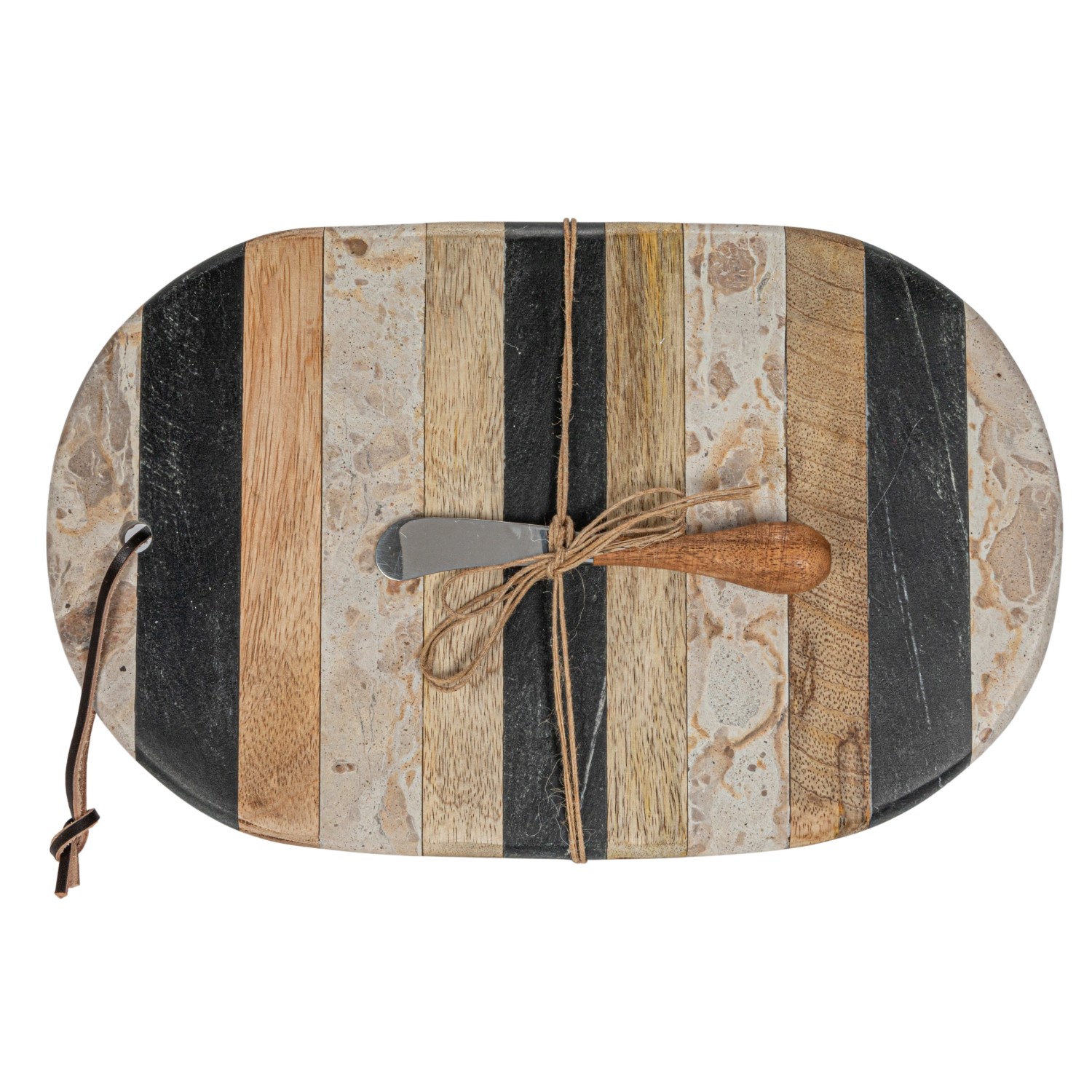 Catalog Name: 13"L x 8"W Oval Marble & Mango Wood Striped Cheese/Cutting Board w/ Leather Tie & Stainless Steel Canape Knife, Black, Beige & Natural, Set of 2 Tied w/ Jute