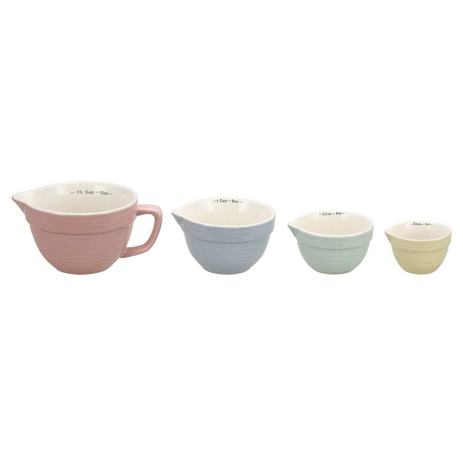 Catalog Name: 1-1/2, 1, 1/2 & 1/4 Cup Stoneware Batter Bowl Measuring Cups, Multi Color, Set of 4