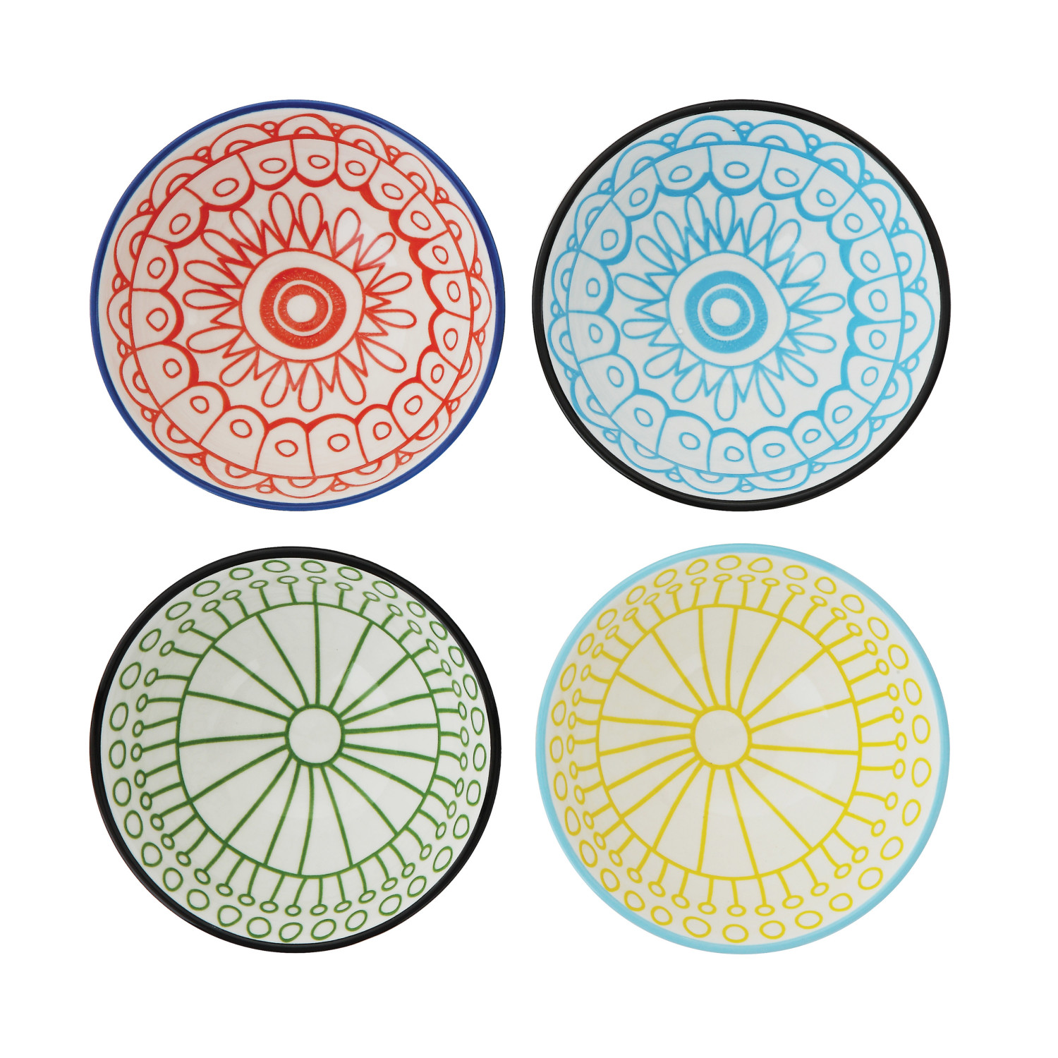 Catalog Name: 4-1/2" Round x 2-1/4"H Stoneware Bowl w/ Pattern & Colored Rim, 4 Styles