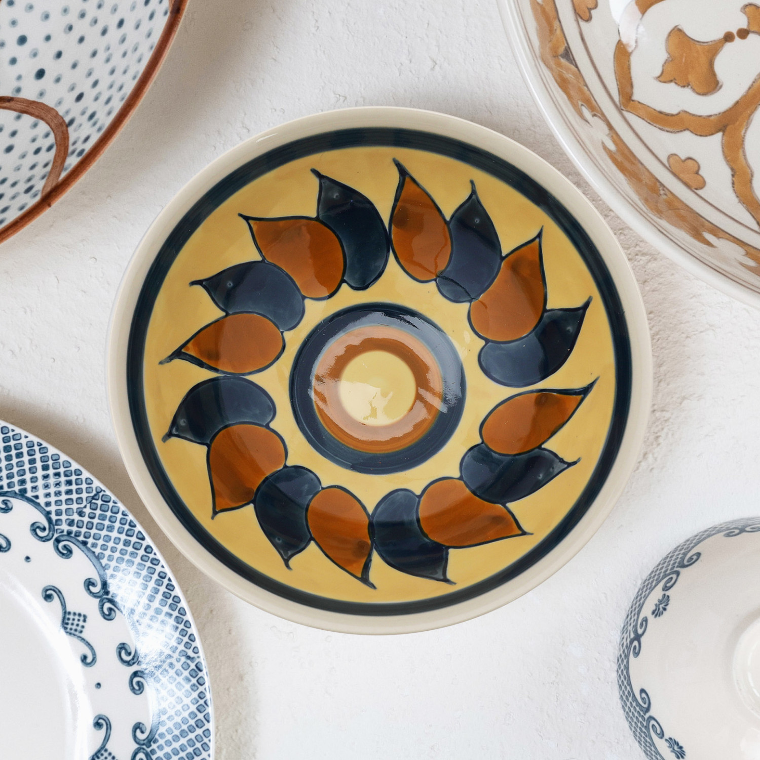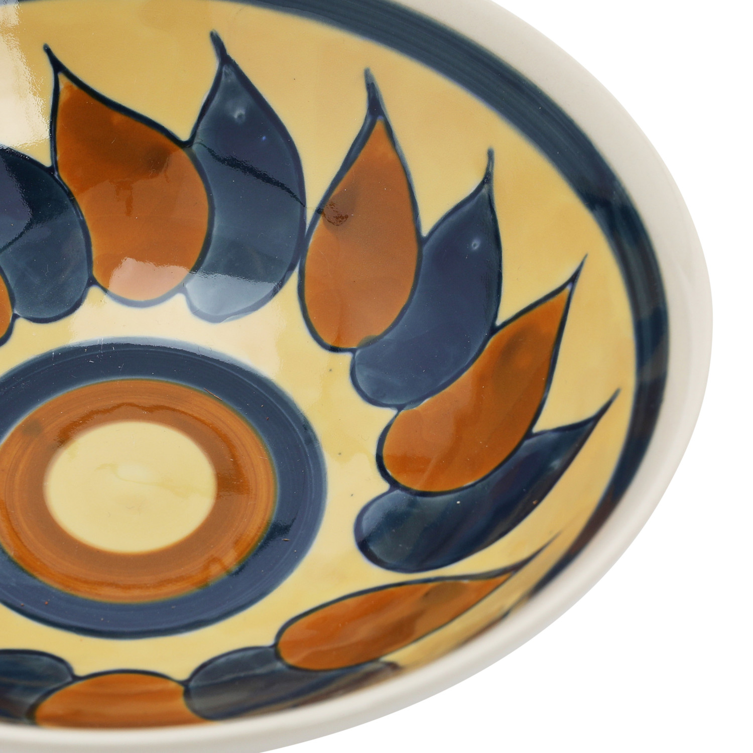 This eclectic stoneware bowl showcases an intricately hand-painted floral design.