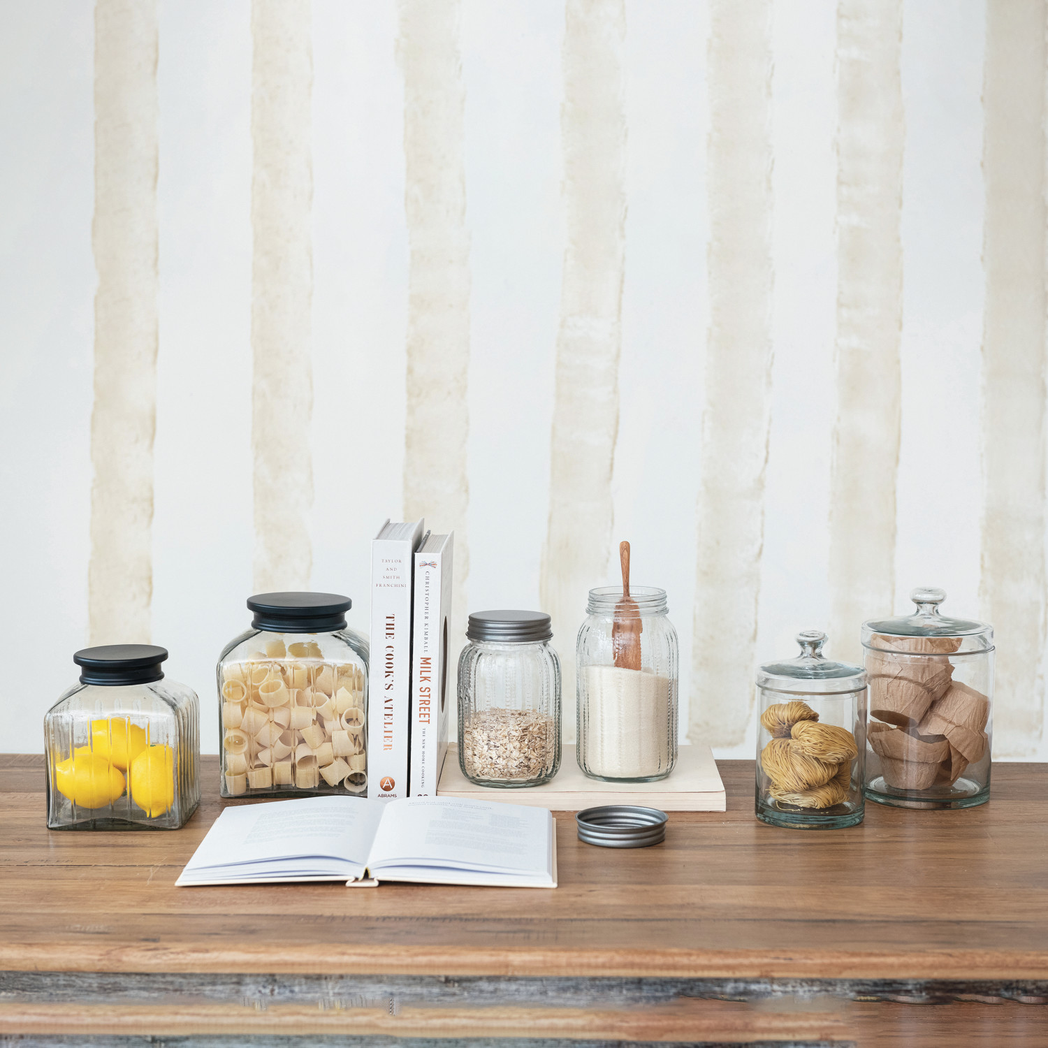 This Embossed Glass Jar with a metal lid labeled "Coffee" is a classic kitchen staple with a twist. The clear glass body, adorned with a delicate embossed pattern, allows anyone to see the rich hues of the coffee, while the metal lid seals in flavor and freshness. It's a practical piece that doesn't skimp on style, fitting seamlessly into settings that appreciate the rustic appeal of farmhouses, the elegance of French country, or the boldness of industrial design. Beyond its good looks, it's the perfect size to hold a generous supply of coffee, ensuring a morning cup is always within reach.