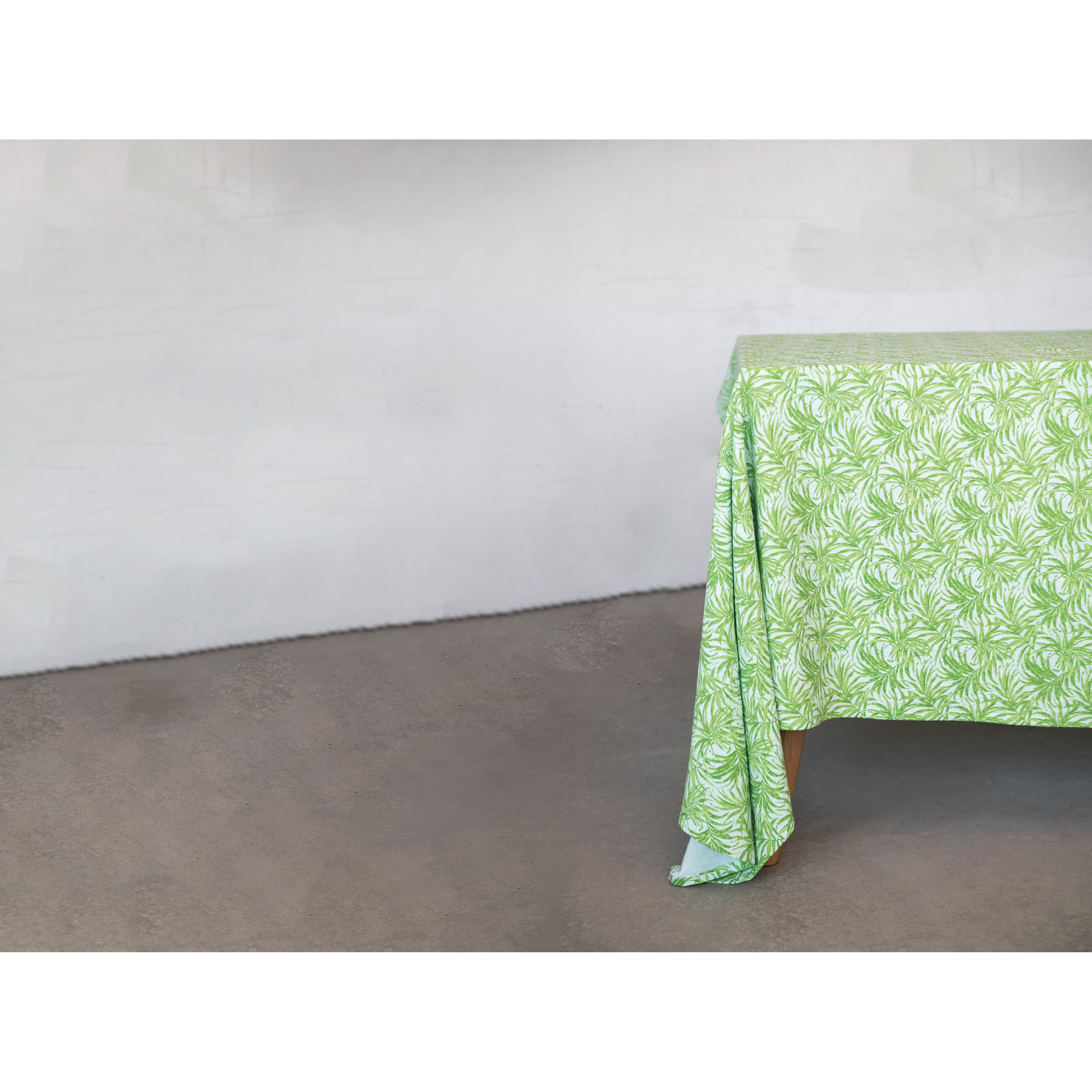Green cotton tablecloth with palm leaf pattern; 30 Degree Wash, Do Not Bleach, Tumble Dry Low, Do Not Dry Clean, Medium Iron. Add a touch of style to any kitchen or dining space with this whimsical tablecloth. Made from 100% cotton. Curate a space that reflects your unique sense of style with intentionally designed home décor.
