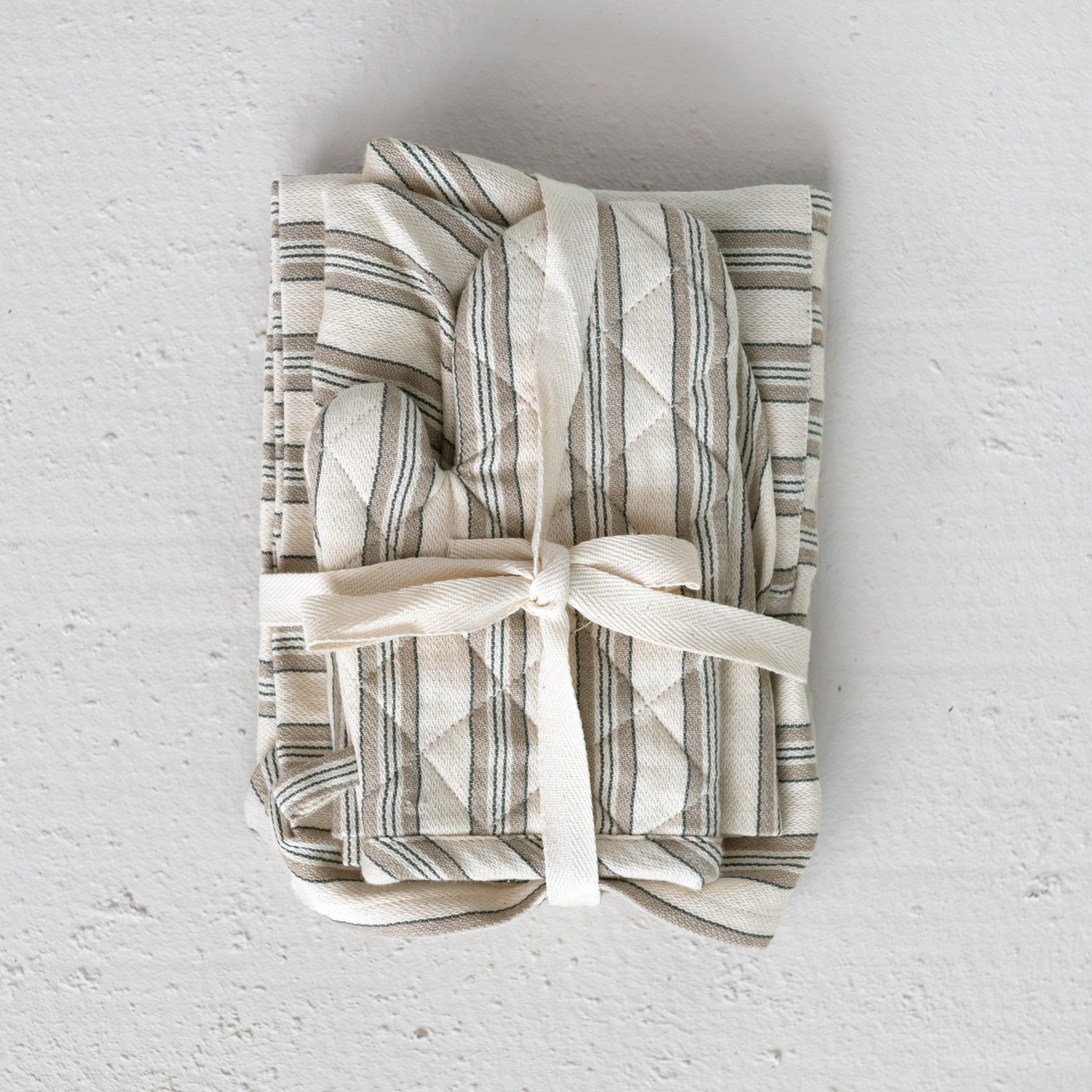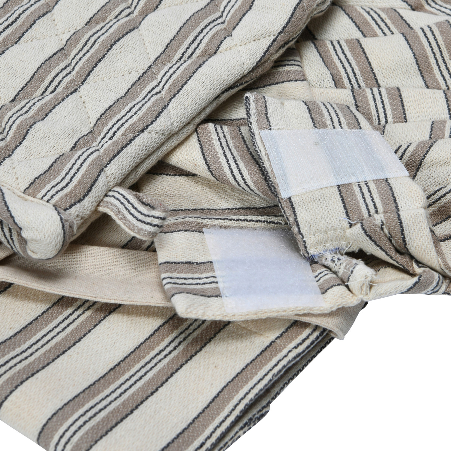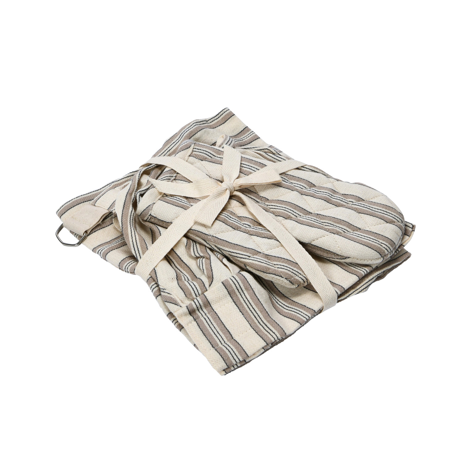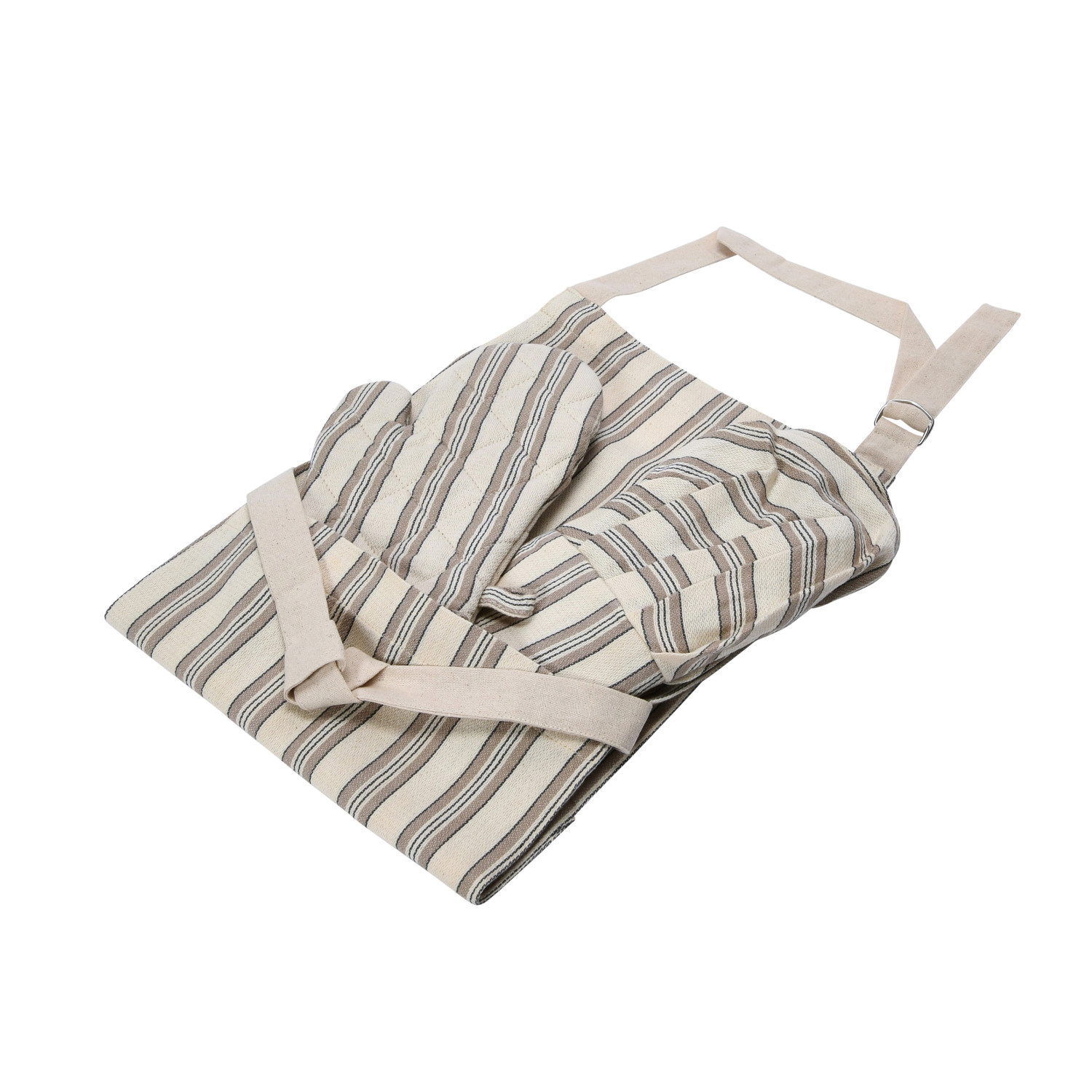 Catalog Name: 24"L x 20"W Cotton Child Apron w/ Chef Hat, Oven Mitt & Stripes, Cream Color, Black & Natural, Set of 3 Tied w/ Cotton Tape