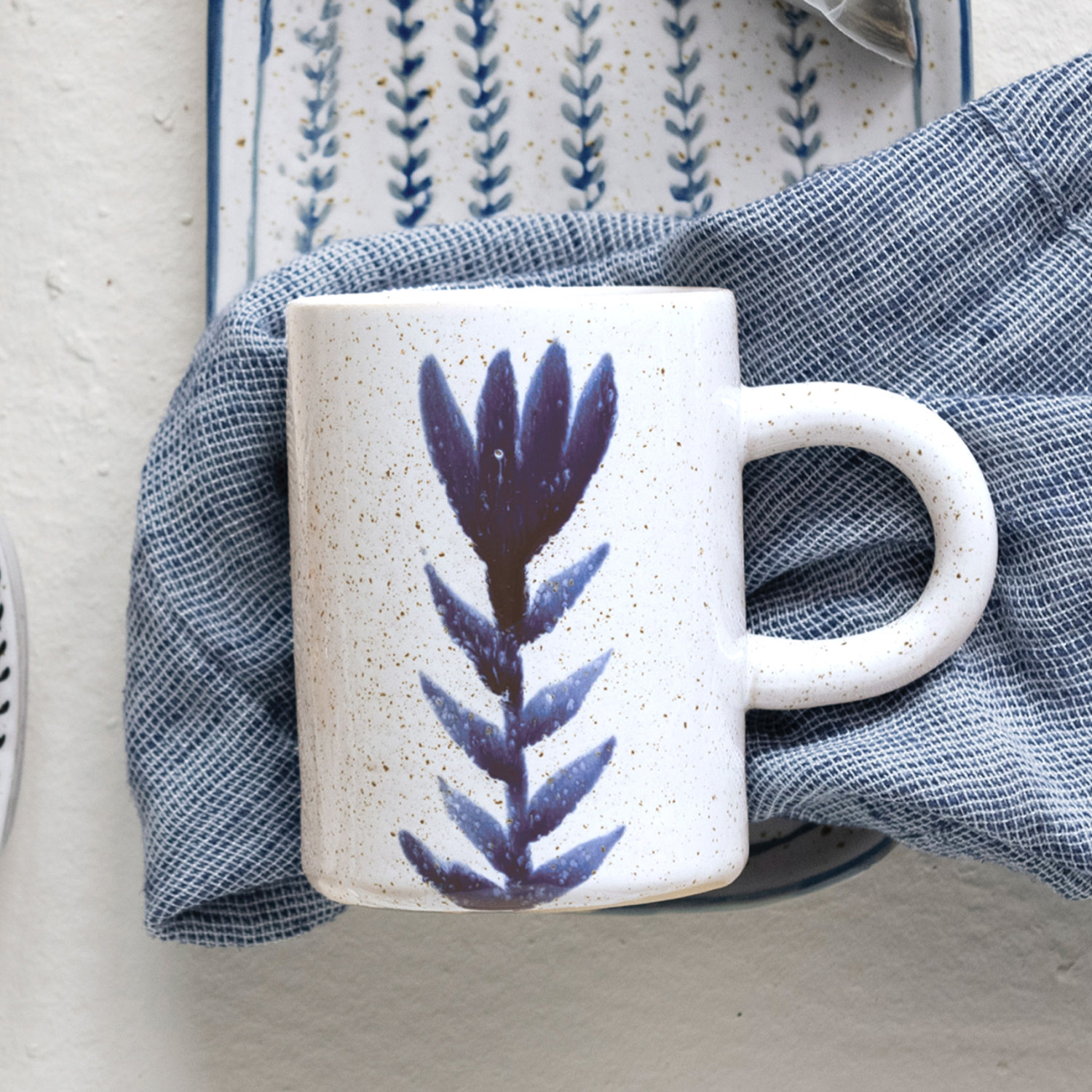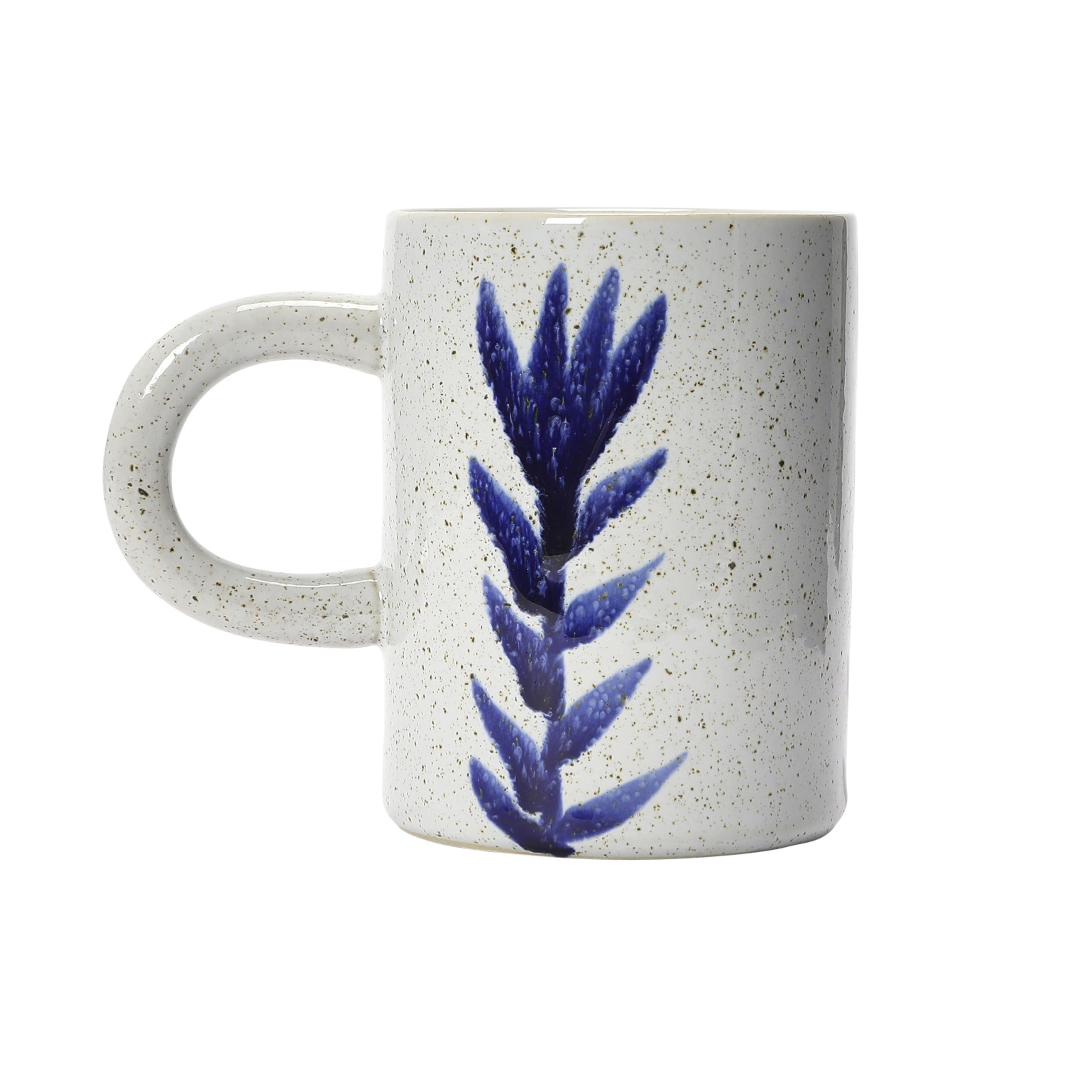 This artfully crafted stoneware mug showcases a hand painted floral design and naturally variating reactive glaze.