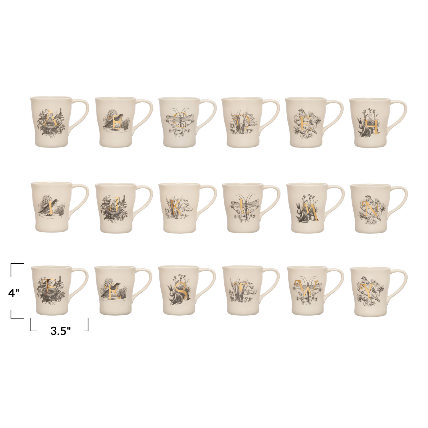 Catalog Name: 3-1/2" Round x 4"H 12 oz. Stoneware Monogram Mug w/ Flora/Fauna Image & Gold Electroplating, White & Charcoal Color, 18 Styles (Assortment Includes All Letters Except O, F, G, Q, U, V, X & Z)