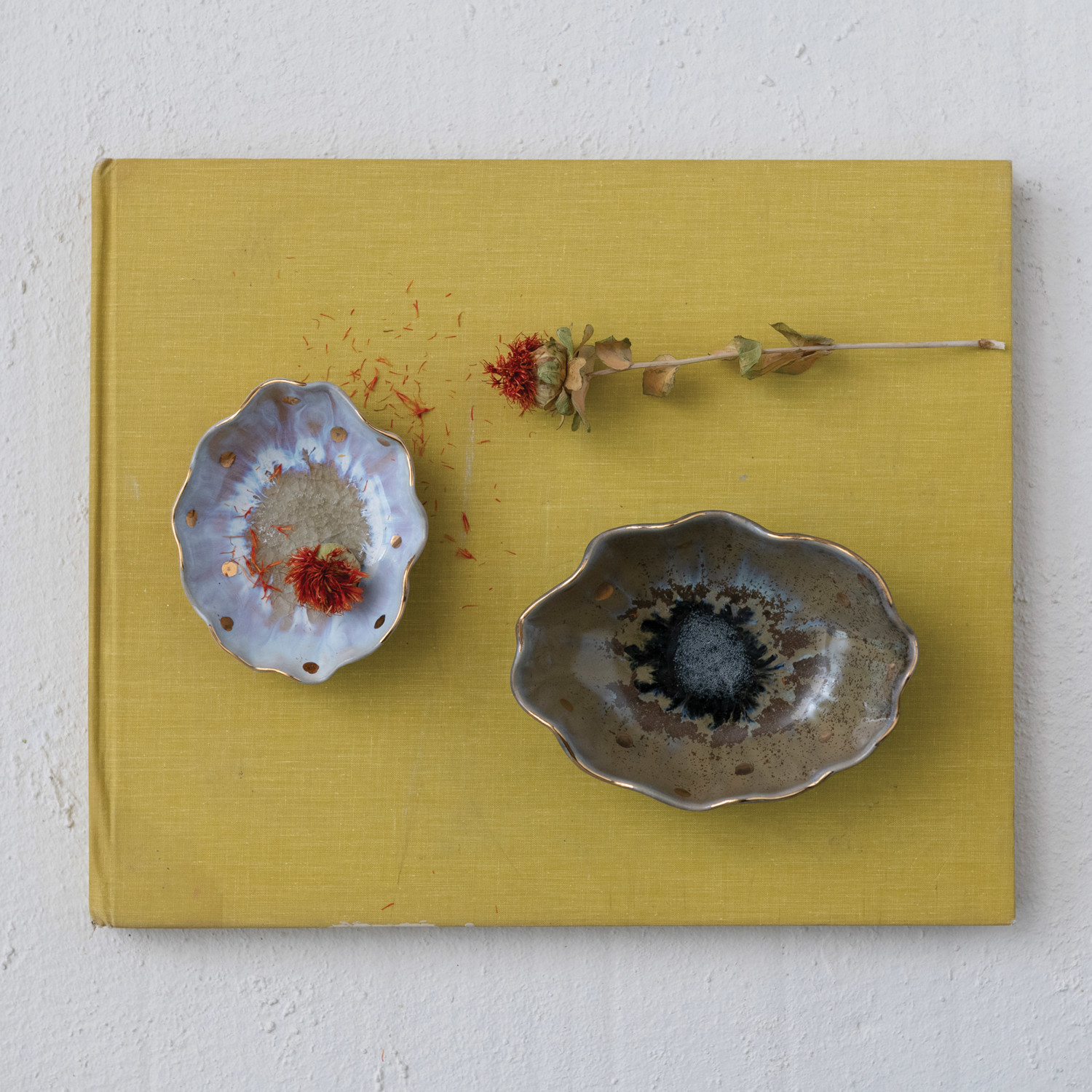 Stoneware Fluted Dish w/ Gold Electroplated Dots & Edge (Each One Will Vary)