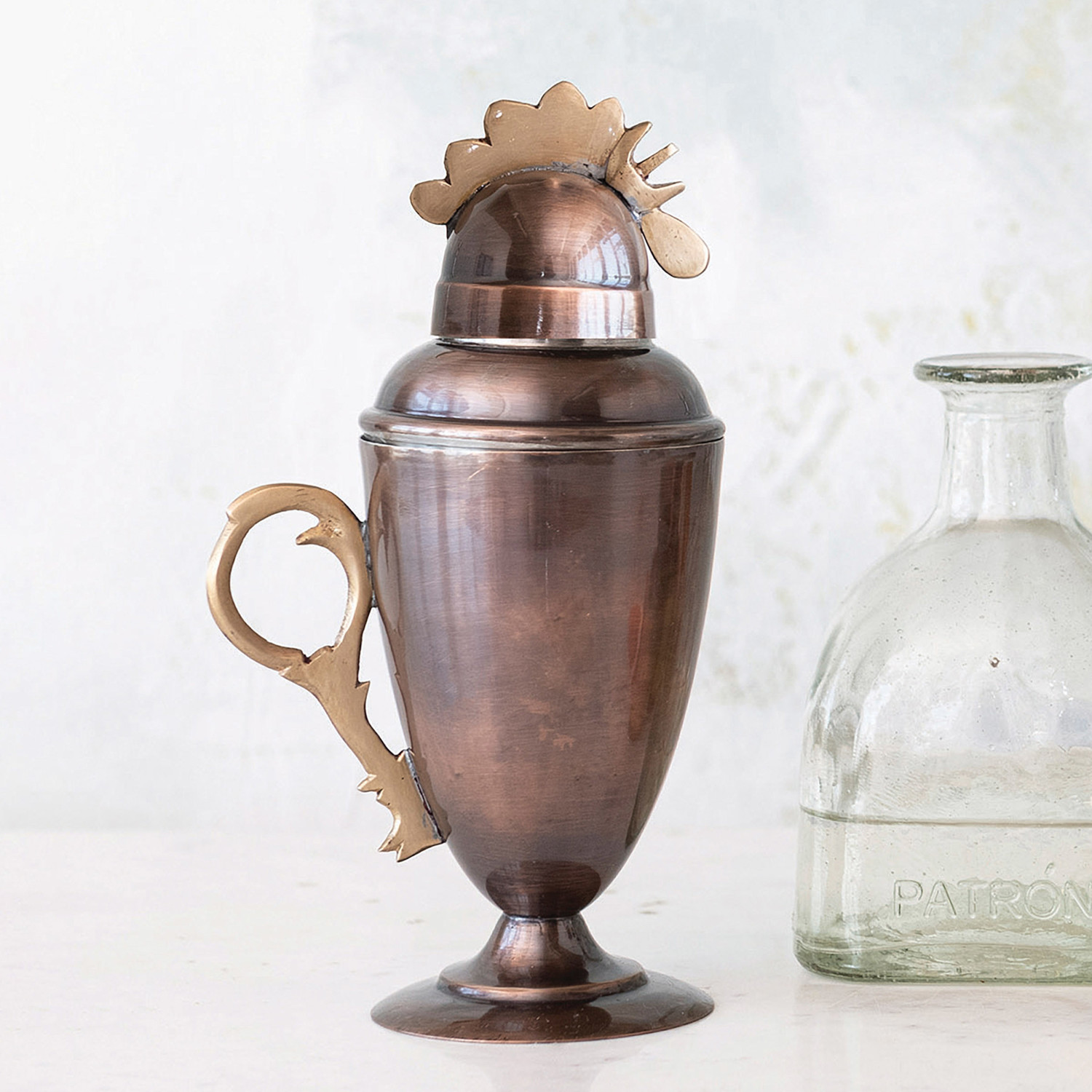 Catalog Name: 5-1/2"L x 4"W x 9-3/4"H 14 oz. Stainless Steel Vintage Reproduction Rooster Cocktail Shaker w/ Brass Accents, Antique Copper Finish