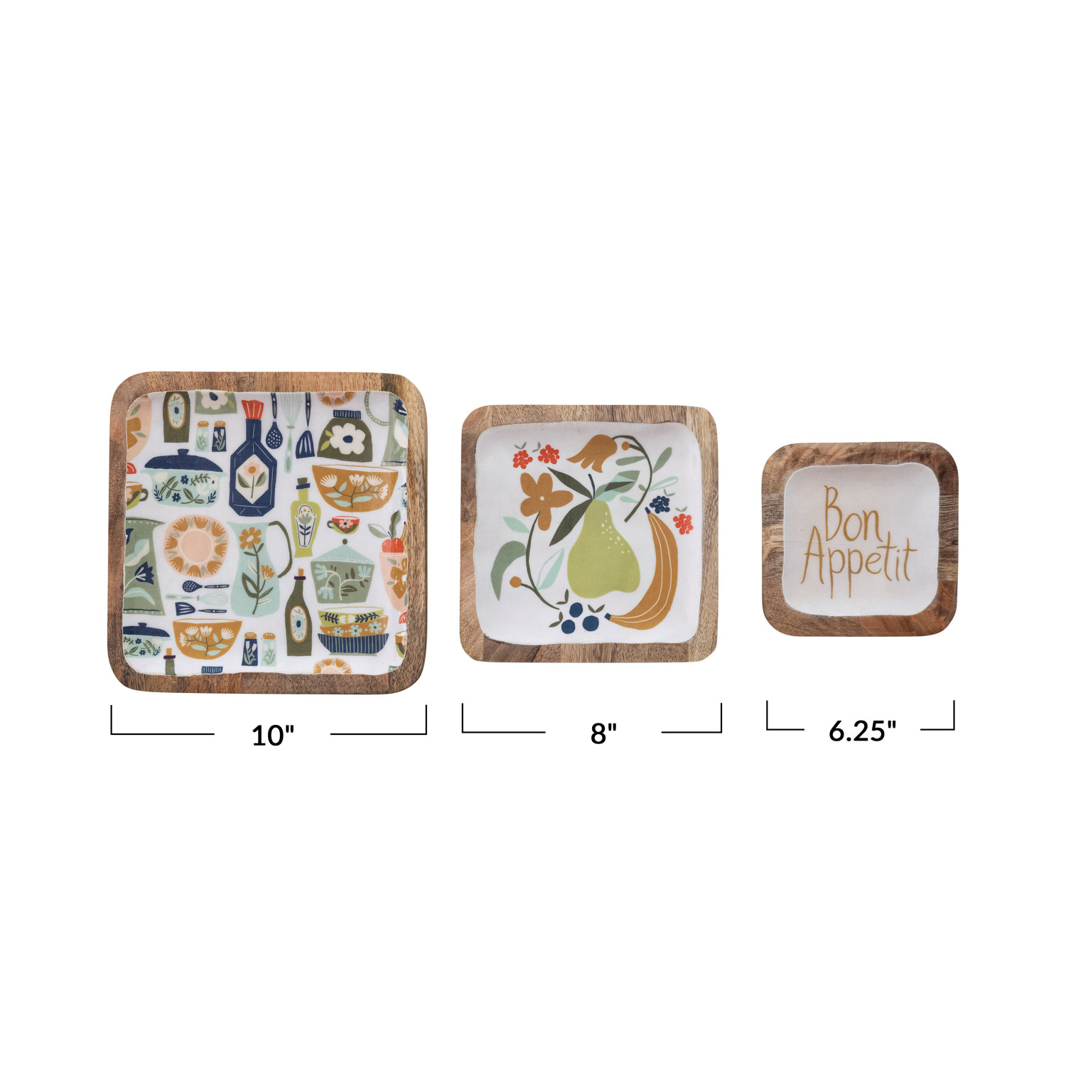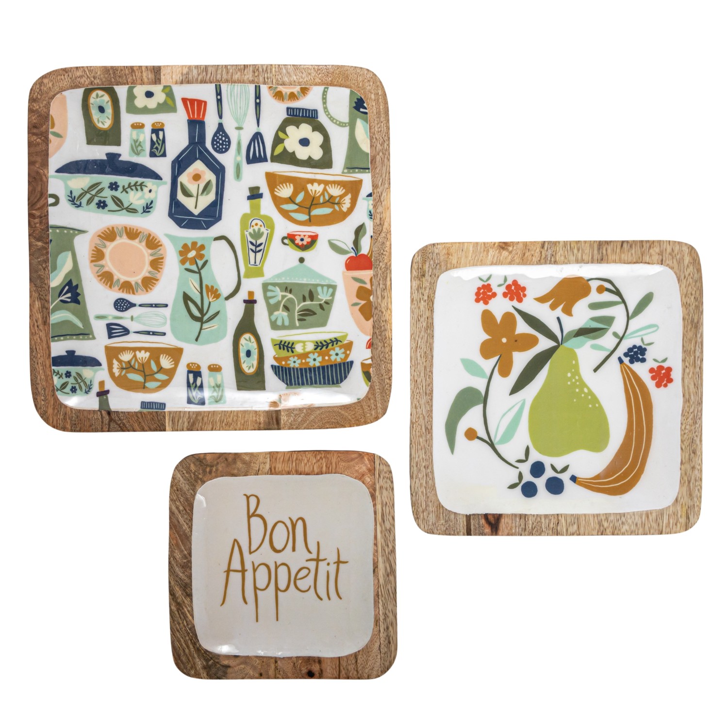 Catalog Name: 10" Square, 8" Square & 6-1/4" Square Enameled Mango Wood Trays w/ Kitchenware Pattern, Fruit & "Bon Appetit", Multi Color, Set of 3 ©