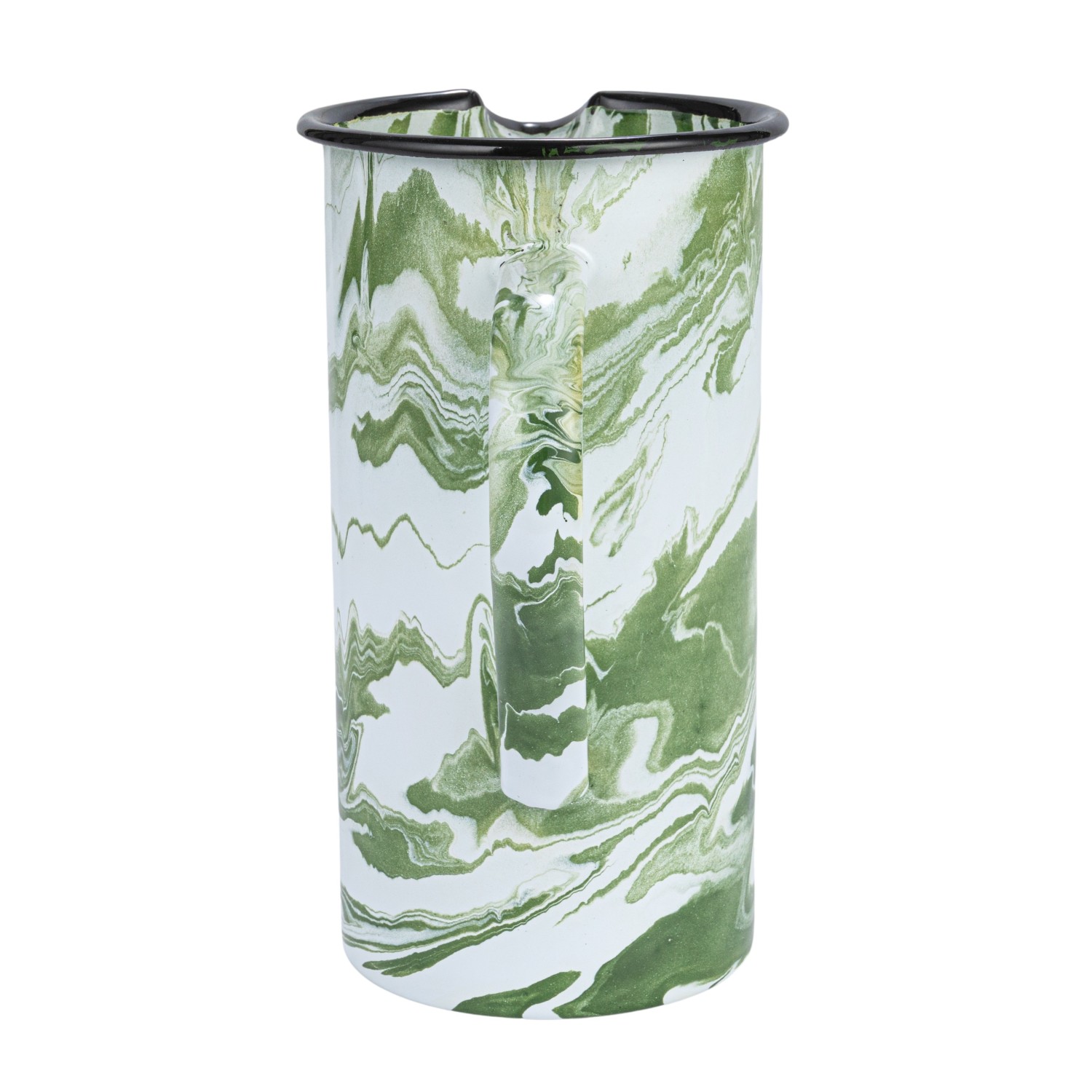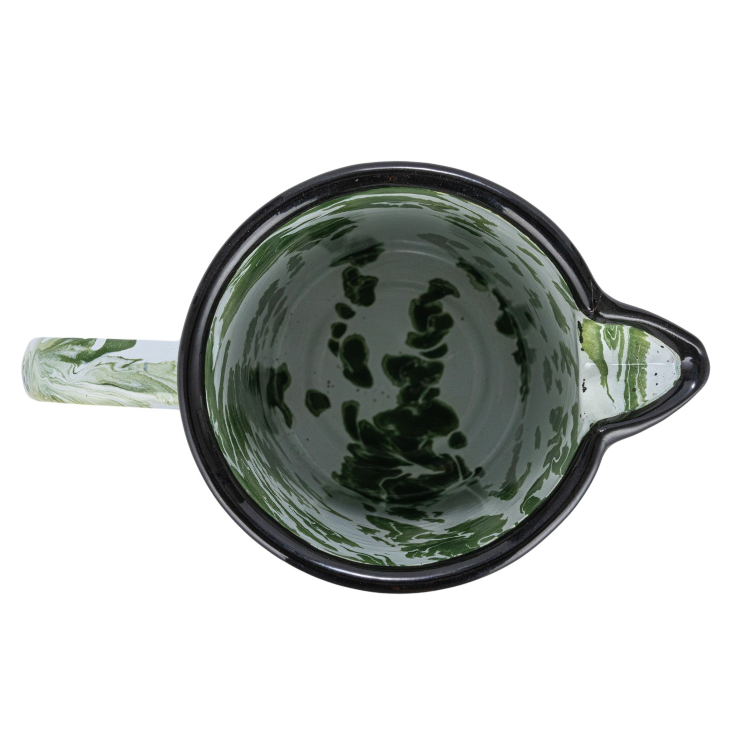 This green and white marbled enameled pitcher with black rim is a charming addition to any serveware collection. Its elegant design features a unique and elegant green and white marbled enamel coating, while the black rim adds contrast. The pitcher is made of durable metal, resistant to high temperatures and frequent use. The smooth enamel coating protects the metal from rusting and corroding, making it easy to clean and maintain. It can hold up to 40 ounces of liquid and is suitable for serving water, juice, tea, or other beverages. The pitcher has a curved handle, spout, and round shape for comfortable holding. It can suit any style, from farmhouse to French country, and adds a cozy touch to the table. Measuring 4.25 inches in diameter and 7.75 inches in height, it can serve a large group of guests.