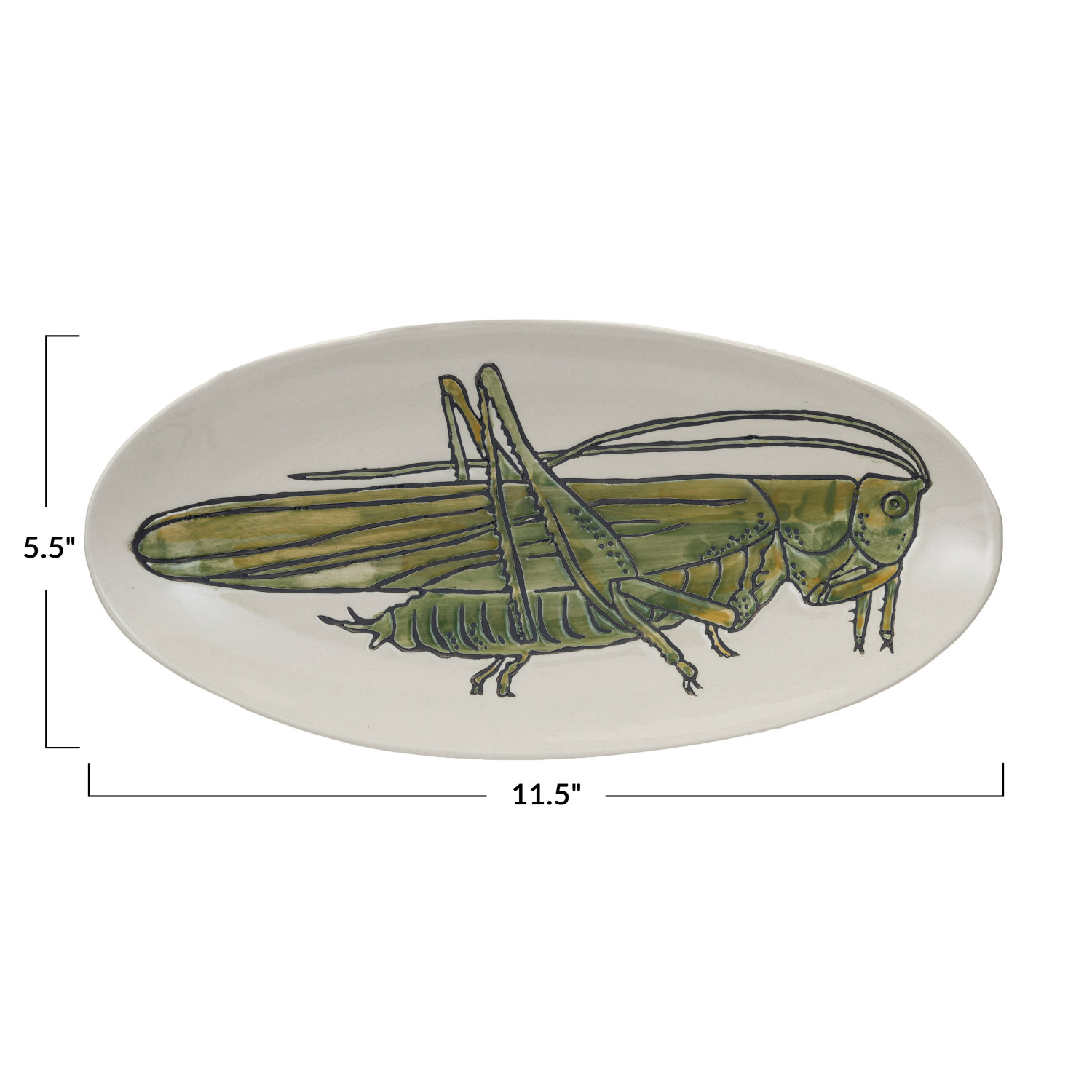 Catalog Name: 11-1/2"L x 5-1/2"W Hand-Painted Stoneware Plate w/ Wax Relief Grasshopper, Green & Cream Color