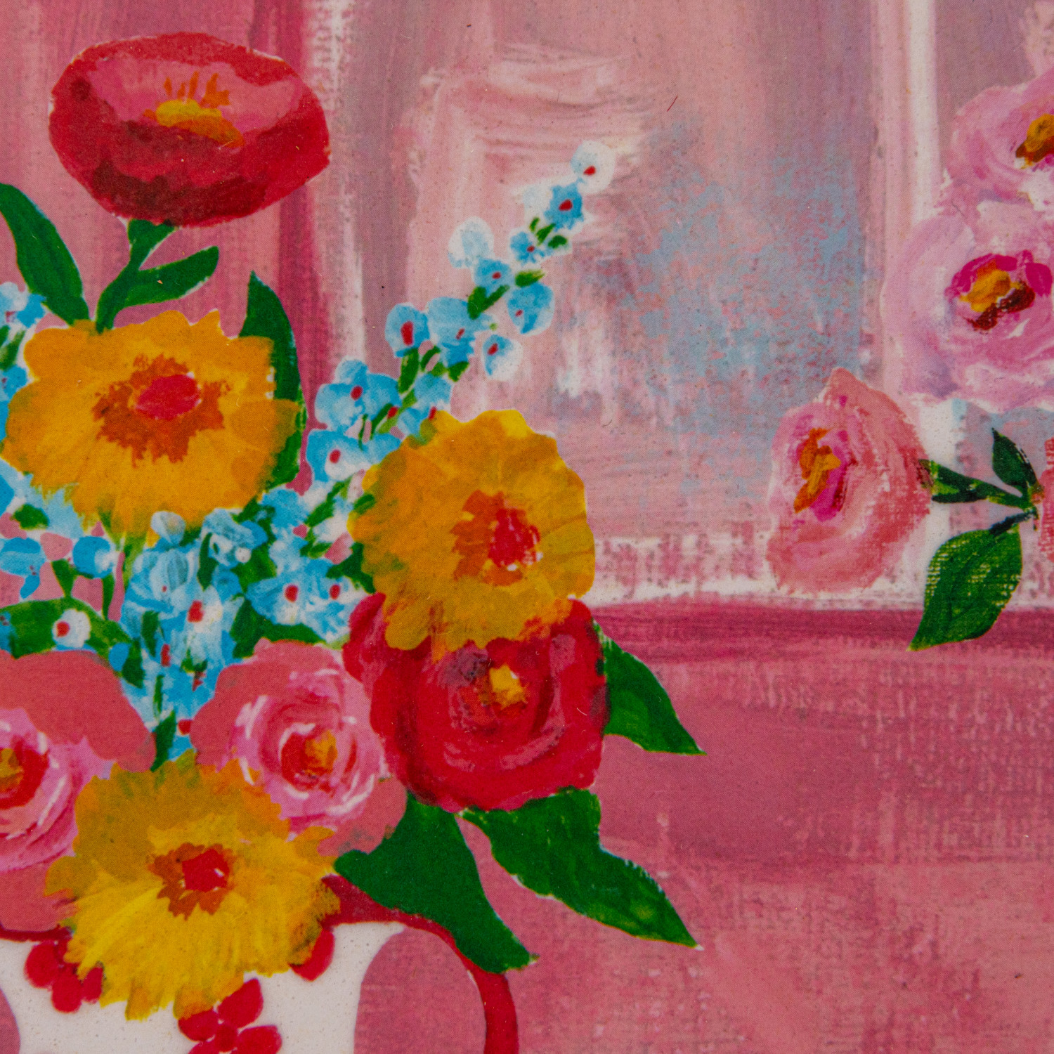 This bamboo fiber tray is a beautiful piece that will add some flair to the home. The tray has a colorful design of flowers in vases that creates a cheerful and cozy vibe. The tray has a rectangular shape with handles on both sides for easy carrying. It is made of eco-friendly bamboo fiber that is durable, lightweight, and biodegradable. Use this tray to serve guests, or to decorate the kitchen, living room, or bedroom. This tray is a unique and lovely item that will enhance any space. This is a beautiful and fun piece that will add beauty and freshness to the table and kitchen serving.