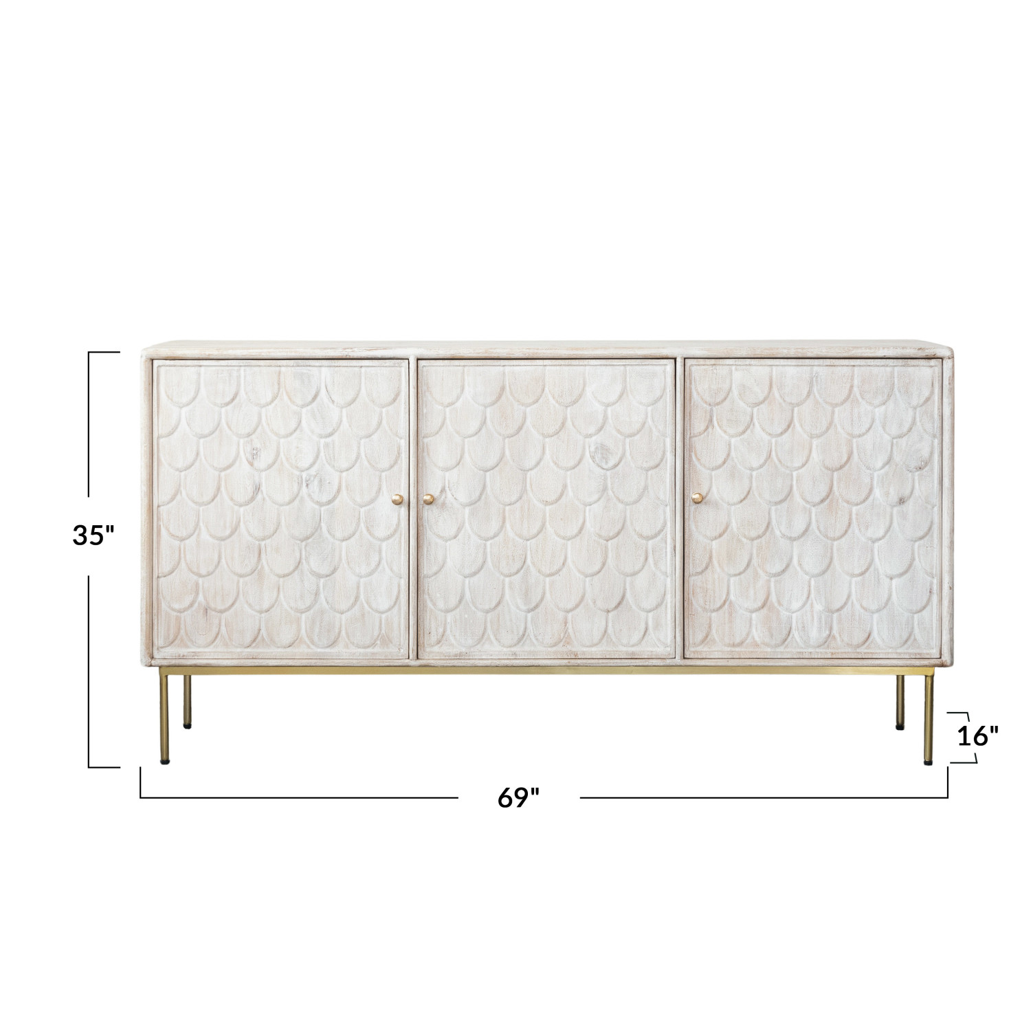 Catalog Name: 69"W x 16"D x 35"H Carved Mango Wood Console w/ 3 Soft Close Doors, 3 Removable Shelves, Antique Brass Finish Metal Legs & Knobs, Bleached, Truck Ship