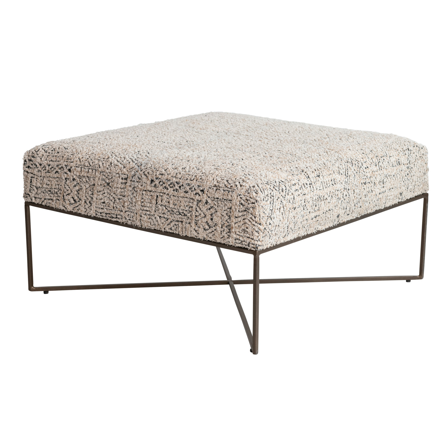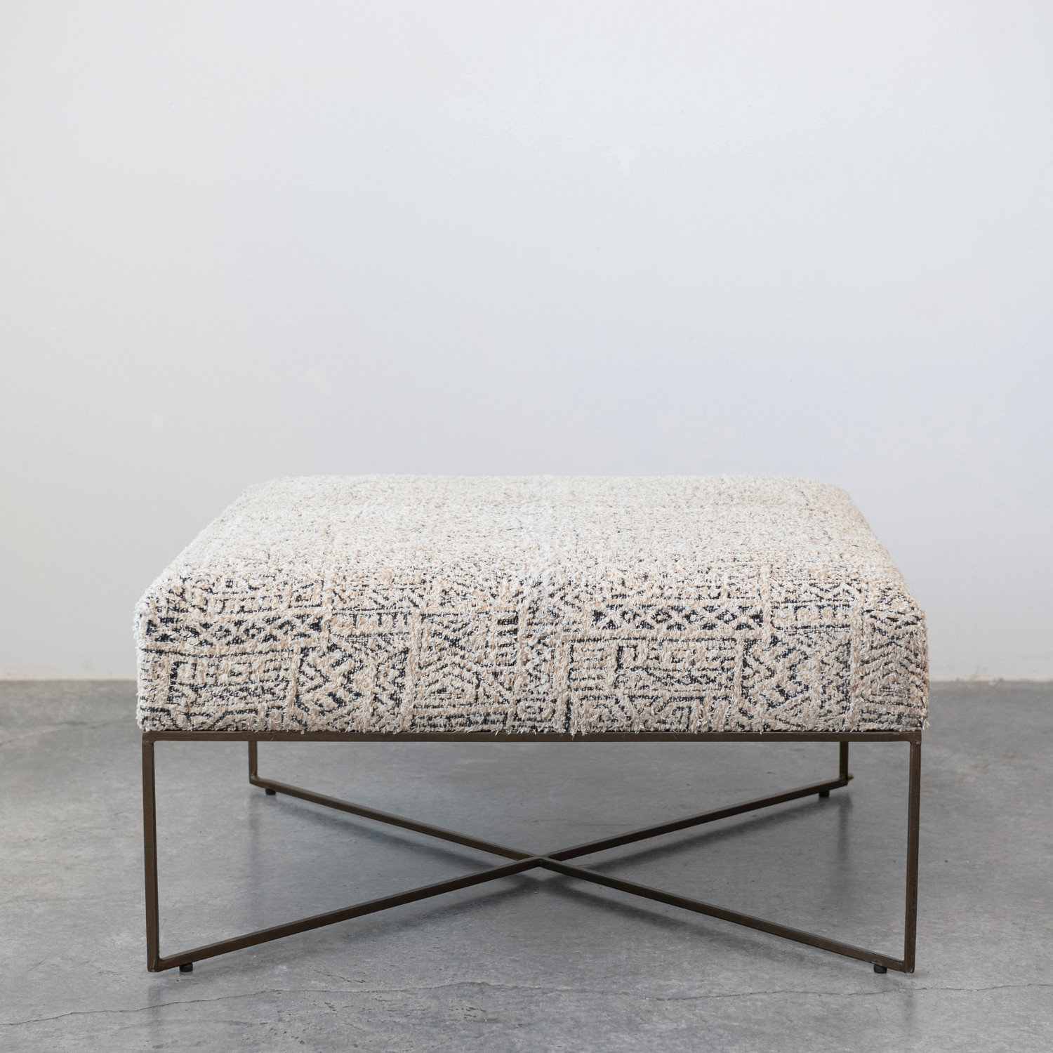 Catalog Name: 34" Square x 18"H Metal & Woven Damask Upholstered Ottoman, Antique Brass Finish, Cream Color & Black, Truck Ship