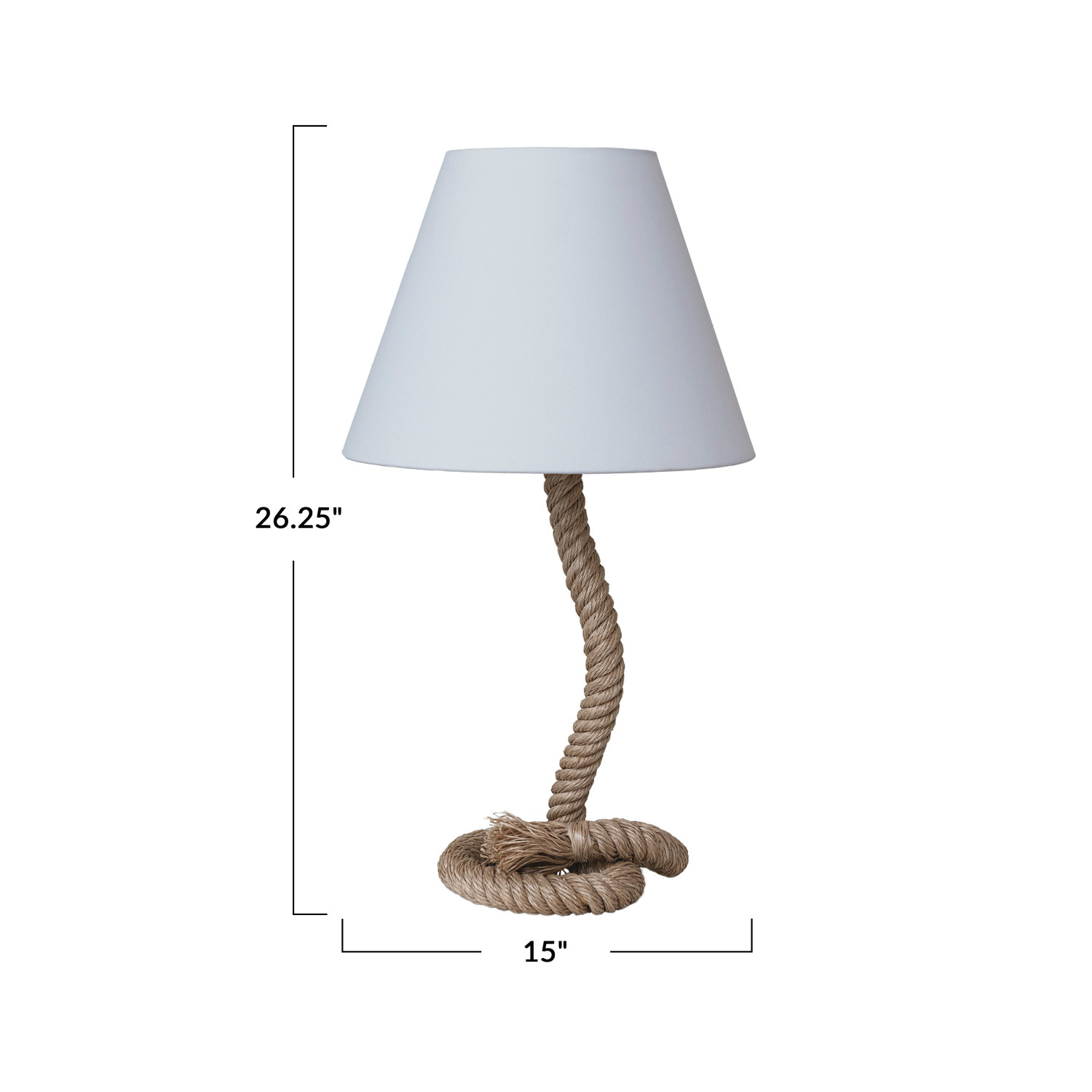 This Table Lamp is a beacon of coastal charm, with its body of brown Manila rope and metal base. It stands 26.25 inches tall and extends 15 inches in length, making it a substantial yet graceful addition to any room. The 7-foot cord provides ample reach for various settings, while the recommended 9W LED bulb ensures a warm, inviting glow. Designed to be versatile, it's equally suited for a living room end table or an outdoor patio, bringing the relaxed vibe of the seaside to any space. Plug-in only; no switch.
