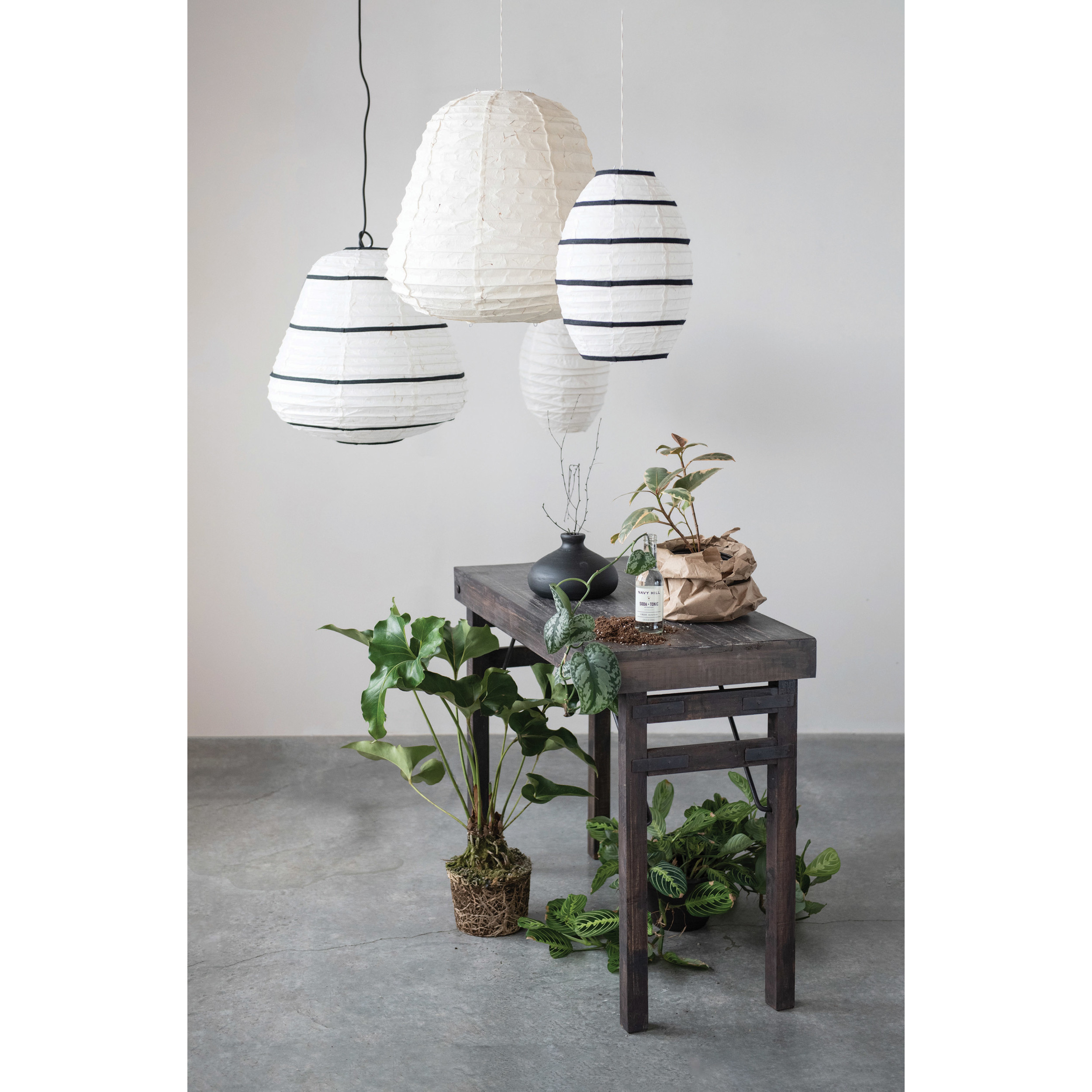 Catalog Name: 10" Round x 14-1/2"H Handmade Paper Pendant Lamp w/ Black Fabric Stripes, 4' Cord (60 Watt Bulb Maximum, Hardwire Only)