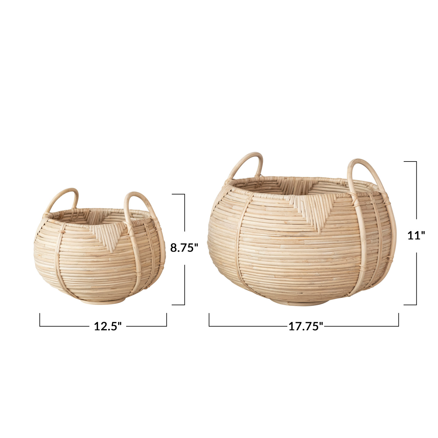 Catalog Name: 17-3/4" Round x 11"H & 12-1/2" Round x 8-3/4"H Decorative Hand-Woven Rattan Baskets w/ Handles, Natural, Set of 2