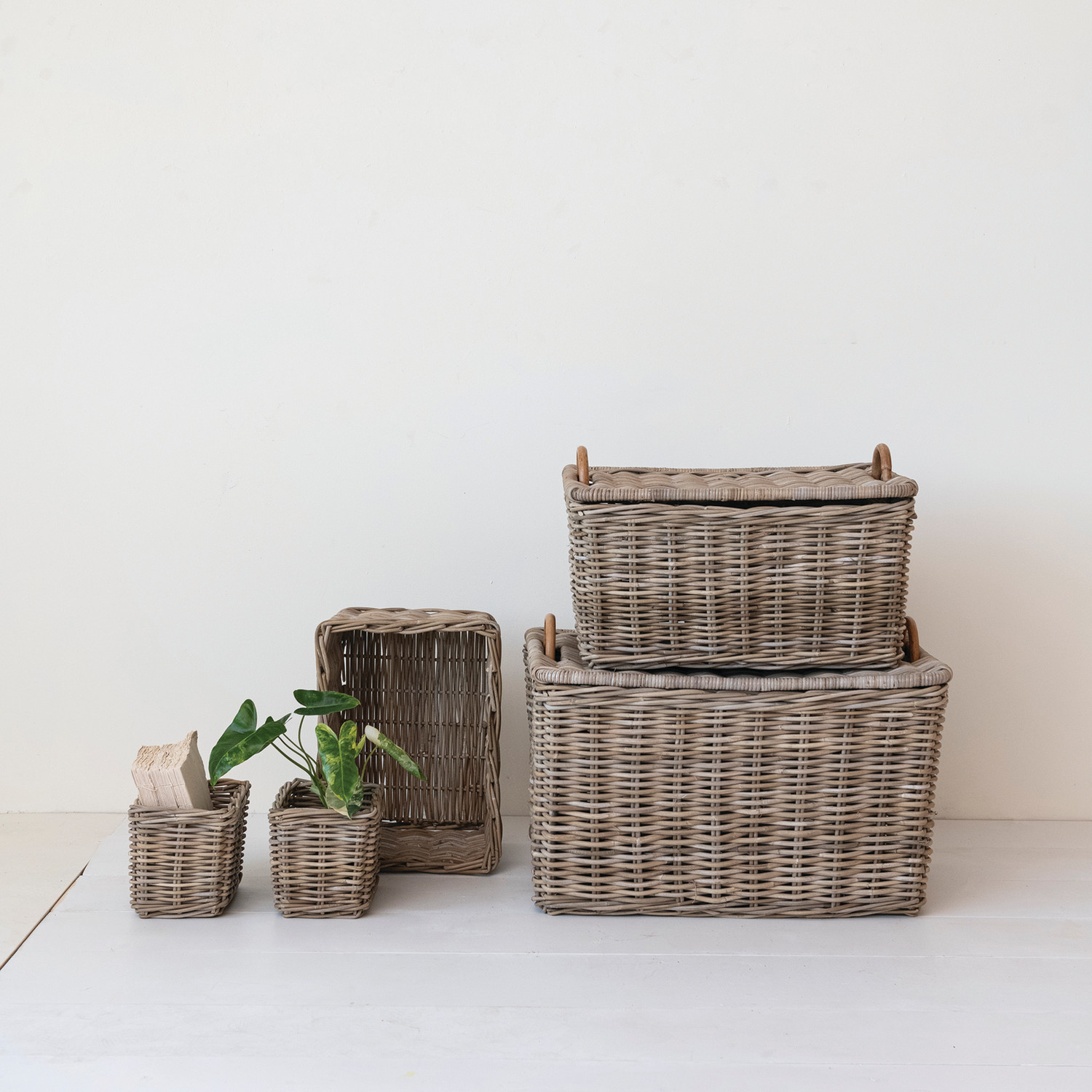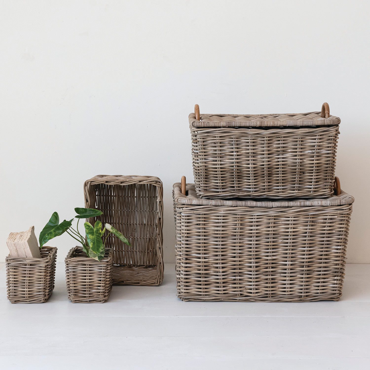 Hand-Woven Rattan Trunks w/ Handles & 3 Nested Baskets, Set of 5