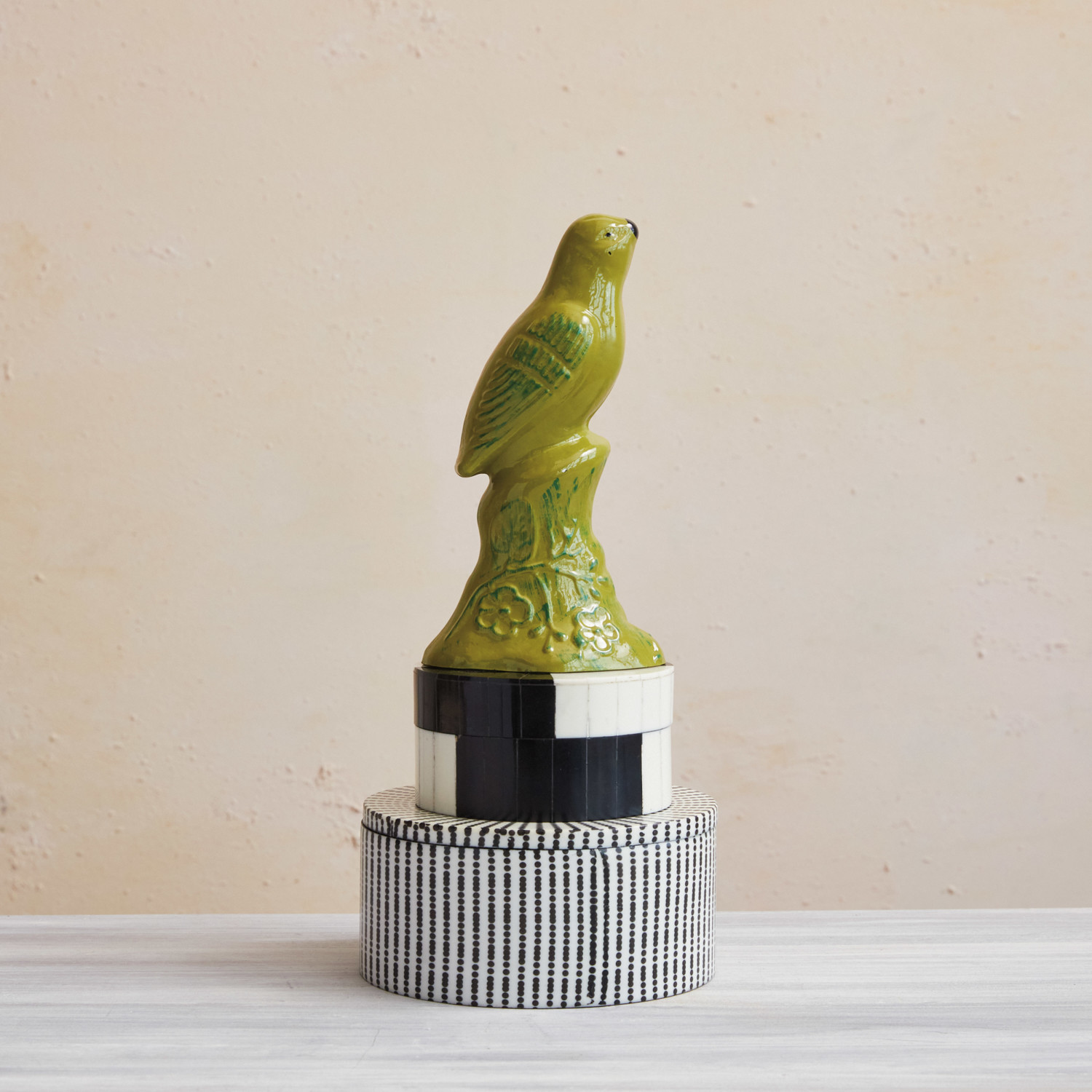 This resin and reclaimed wood box with stripes, black and white is a stylish and practical piece for any home. It consists of a round base and a lid that feature a resin and reclaimed wood construction and a striped pattern. The resin and reclaimed wood construction is durable and smooth, which makes this box last for a long time. The striped pattern creates a chic and contrasted effect that makes this box stand out. The black and white color adds a touch of elegance and simplicity to this box. It is perfect for storing and displaying jewelry, accessories, trinkets, or other small items in the bedroom, bathroom, or living room. It can also be used as a decorative accent on a shelf, table, or mantel. This box is easy to clean and maintain, and it will enhance any space with its beauty and style. It measures 4.5 inches in diameter and 2.25 inches in height, making it suitable for any space. This resin and reclaimed wood box with stripes, black and white is a must-have for anyone who loves style and functionality.