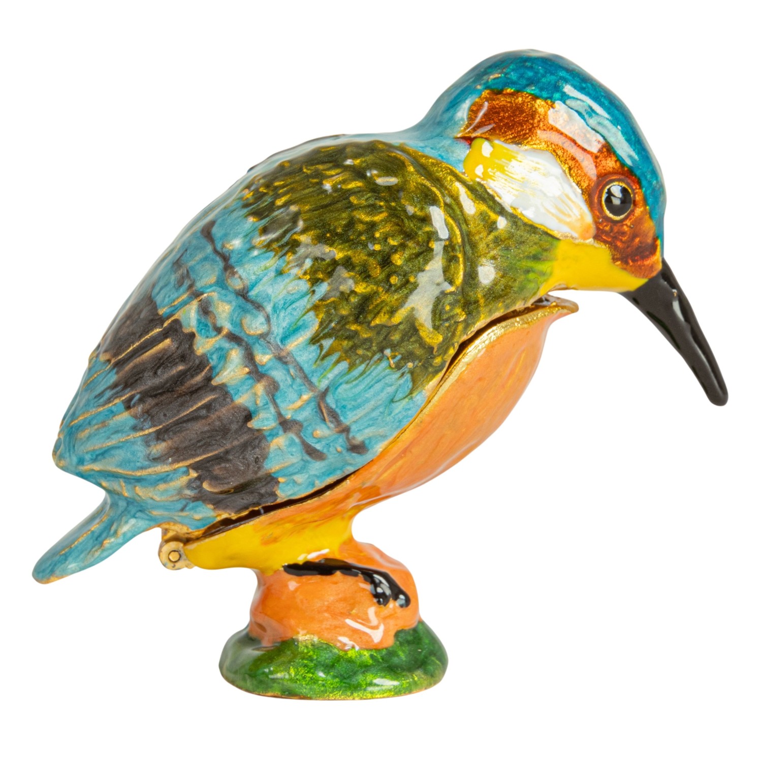 Catalog Name: 1-1/2"L x 2-1/4"W x 2-1/4"H Enameled Metal Kingfisher Shaped Trinket Box, Gold Finish & Multi Color