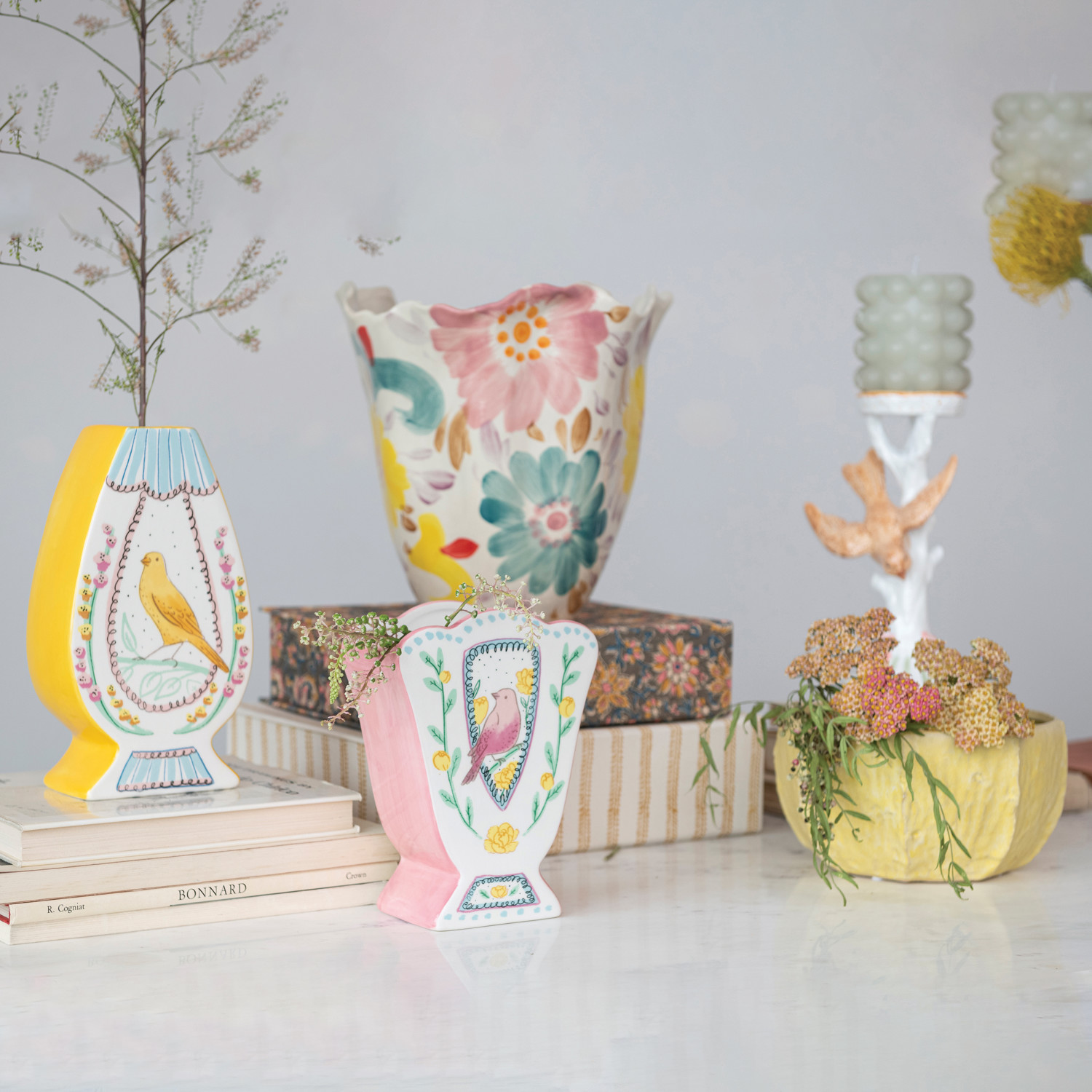 Mix and match the sculptural silhouettes, stylish hues, and unique finishes of our candle and incense holder collection to create the ultimate tablescape. Instantly transform a dining table, dresser, or mantelpiece into a stunning display of ambiance and warmth with carefully chosen bases for a refined candlelight arrangement. Choose from a wide array of materials from iron and marble to wood and stone, and styles from mid-century modern and glam to farmhouse and vintage. From classic taper holders to global-inspired pillar holders and contemporary incense burners and shimmering votives, this collection will create a welcoming atmosphere that is guaranteed to impress. This French country-inspired candle holder features a multicolor silhouette of a bird flying near a tree. Display in a living space of any style from cottage to French country. Wipe clean with dry cloth. Made from resin and stone powder.