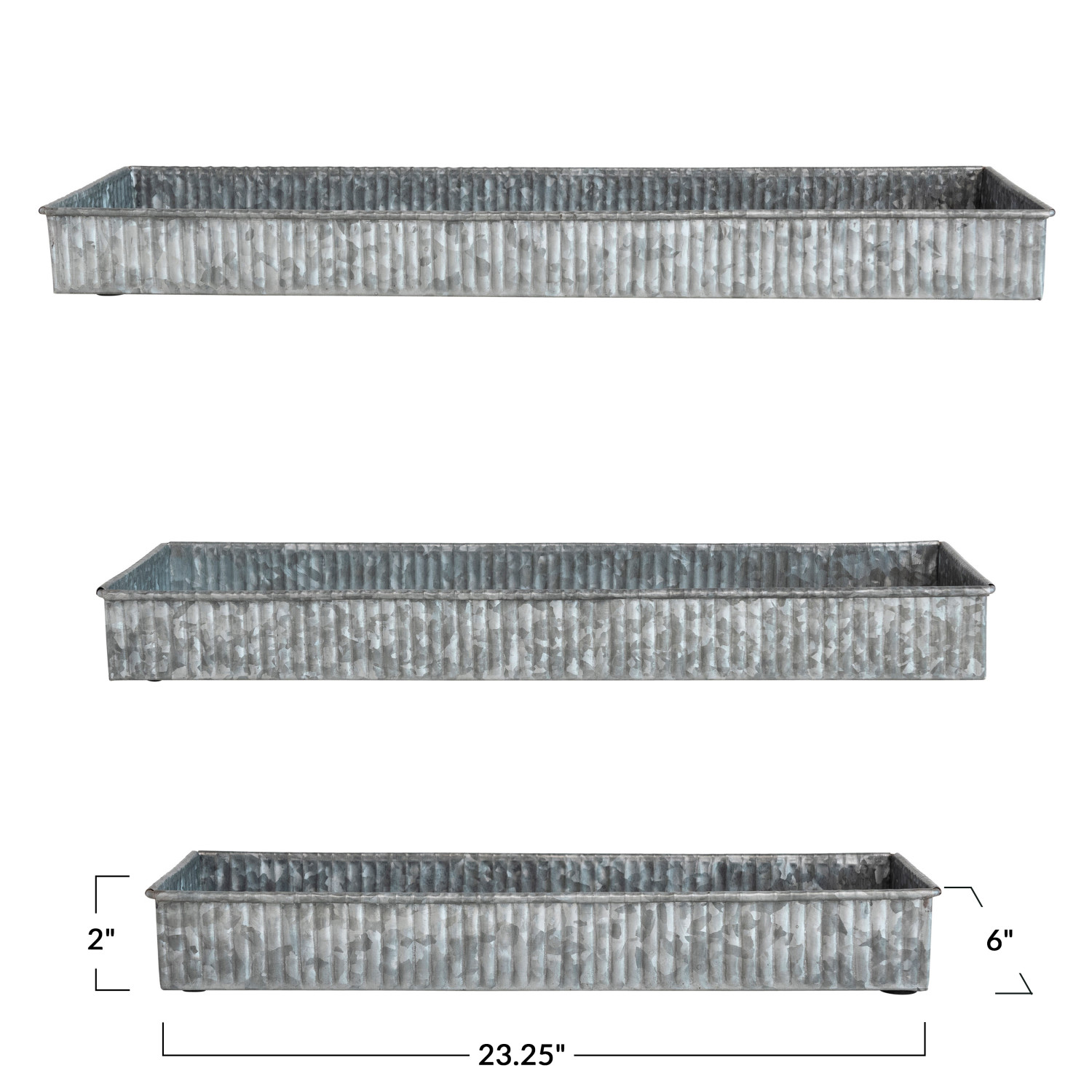 Catalog Name: 23-1/4"L x 6"W x 2"H, 19-1/4"L x 6"W x 2"H & 15-3/4"L x 5"W x 2"H Decorative Galvanized Metal Trays, Set of 3