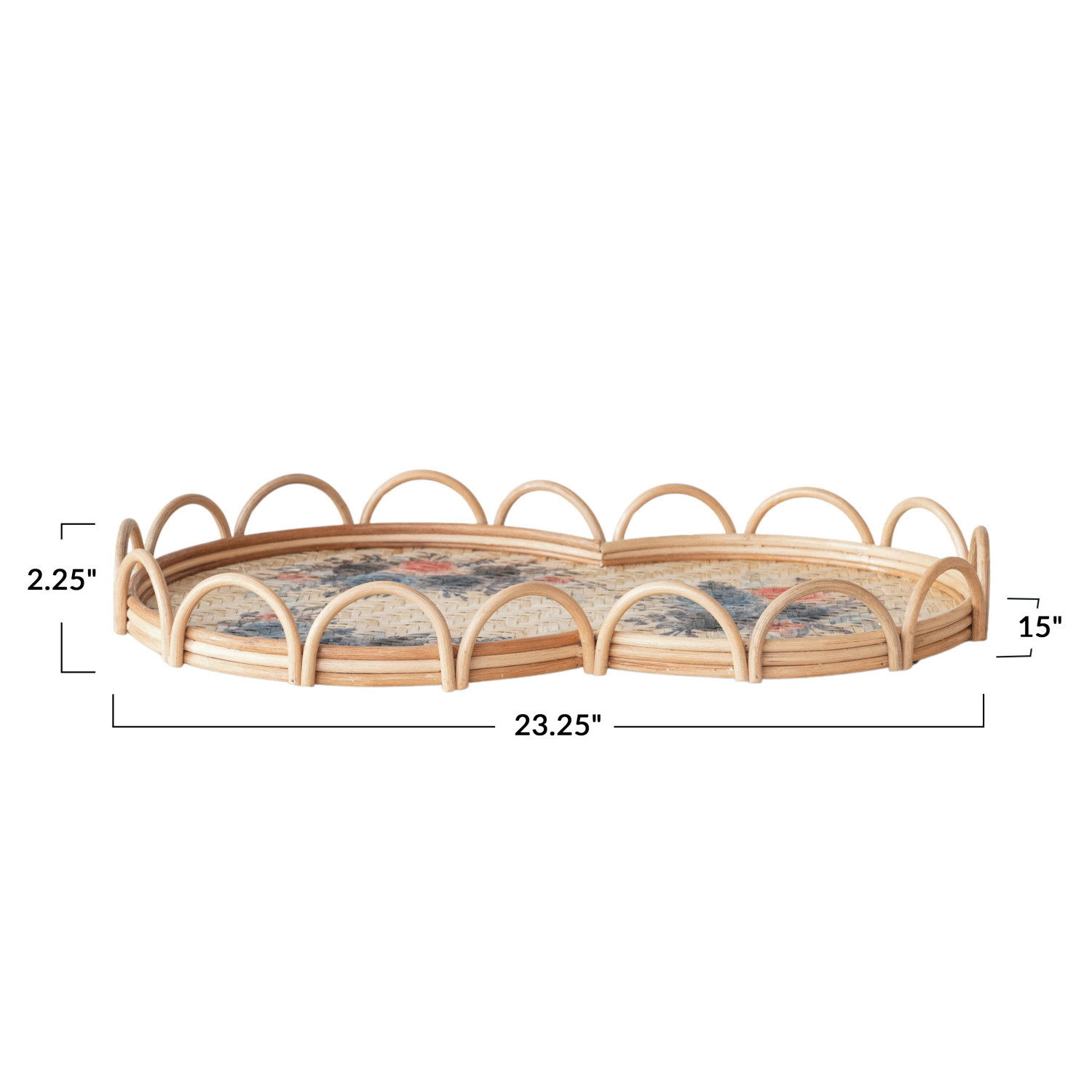 Catalog Name: 23-1/4"L x 15"W x 2-1/4"H Decorative Rattan & Bamboo Scalloped Tray w/ Printed Florals, Multi Color