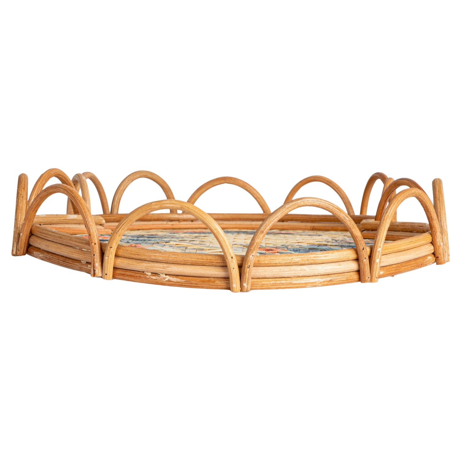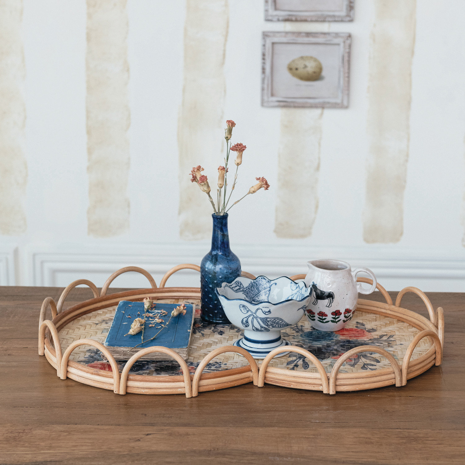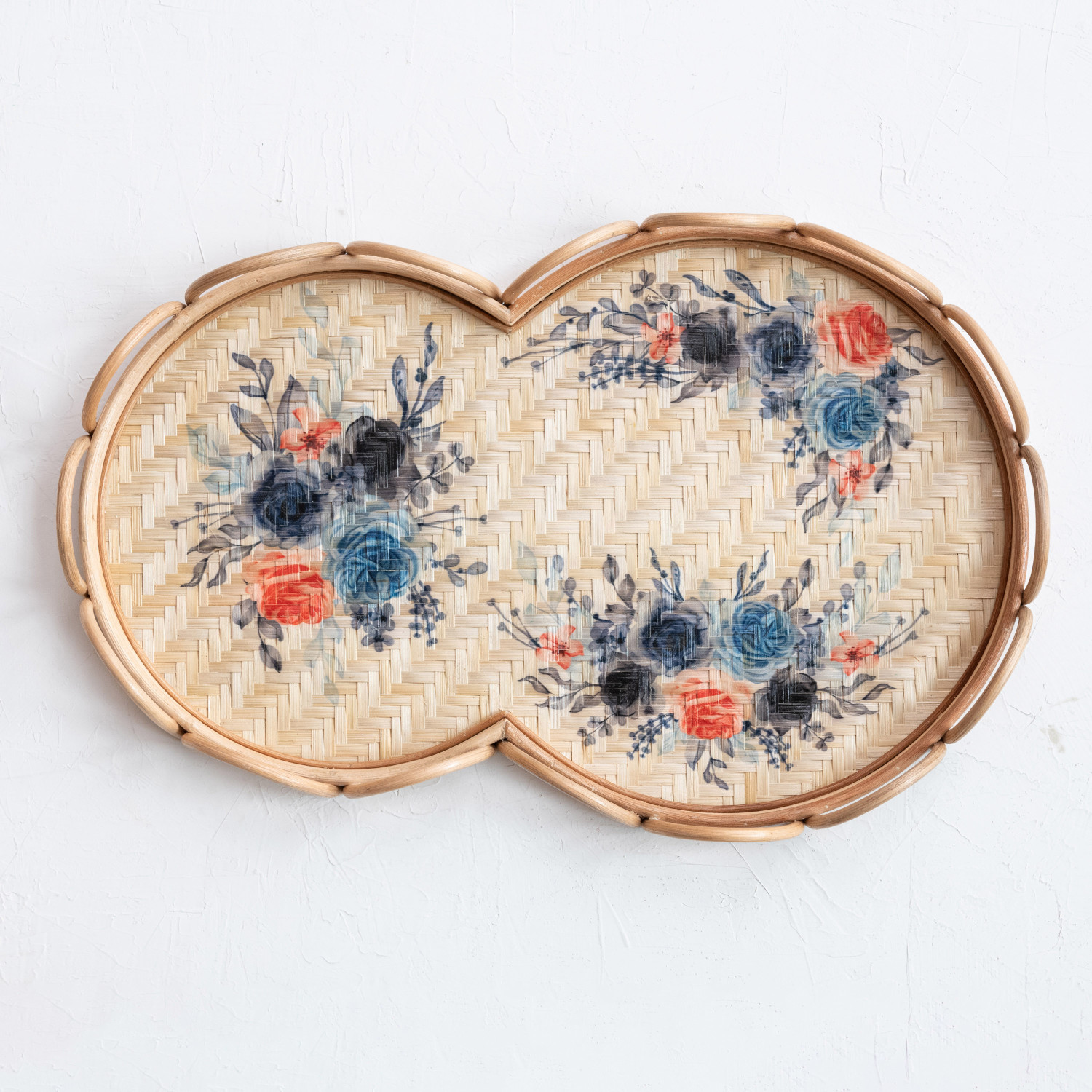 Decorative Rattan & Bamboo Scalloped Tray w/ Printed Florals