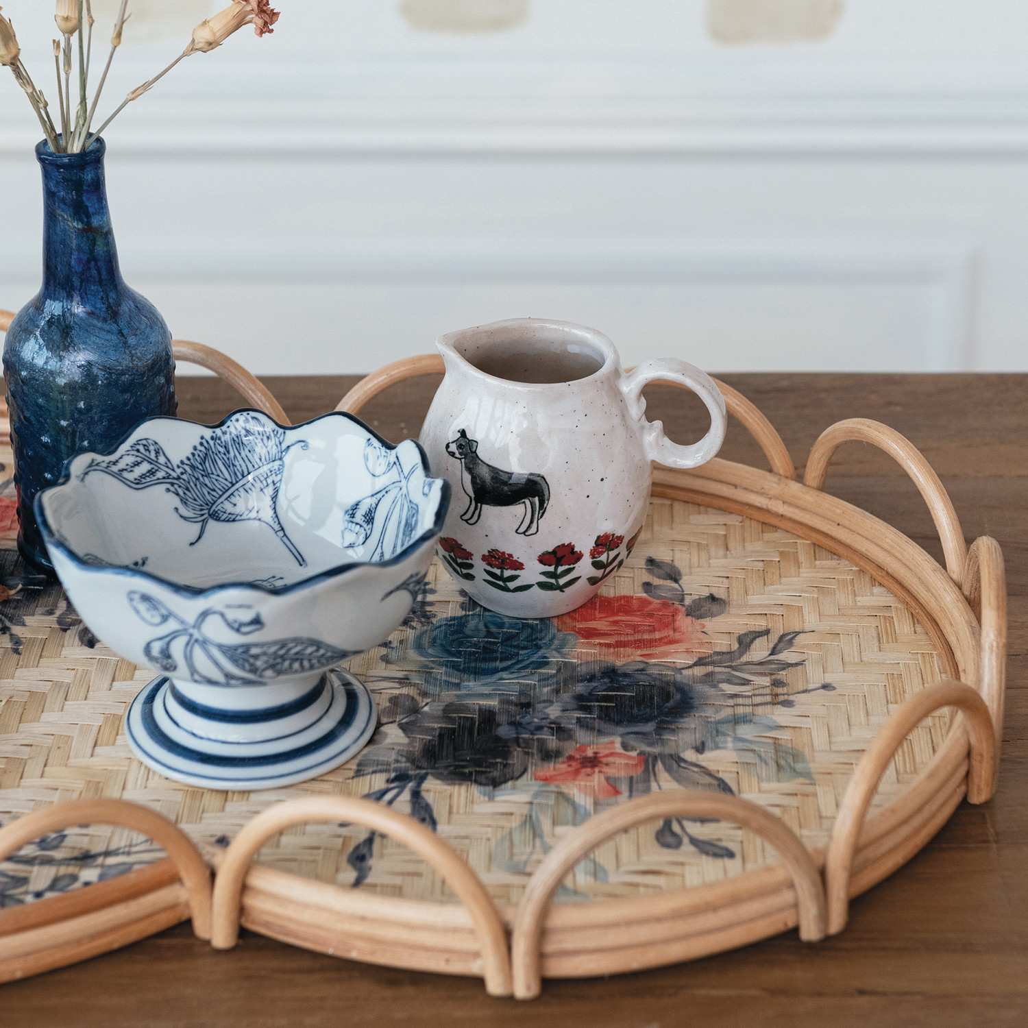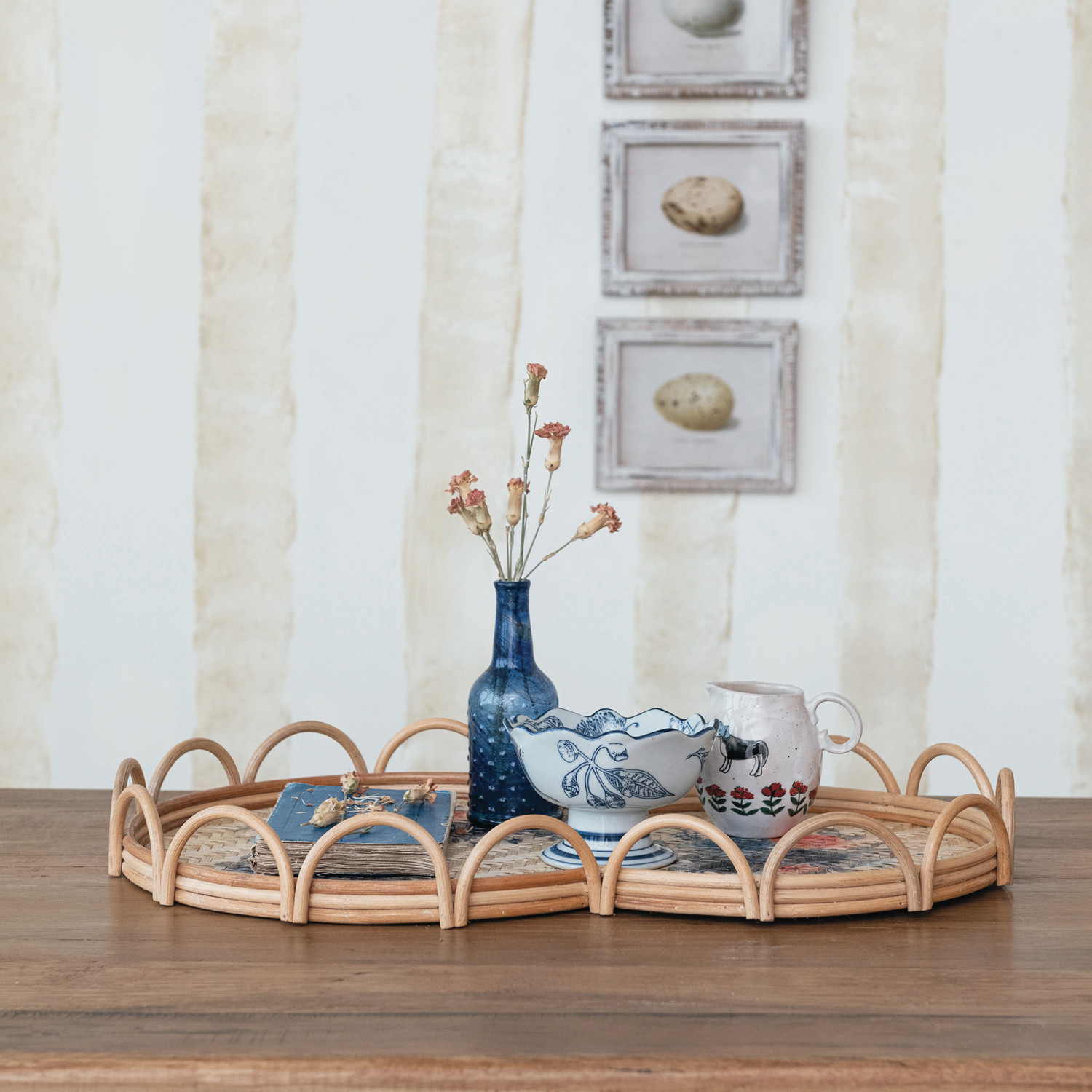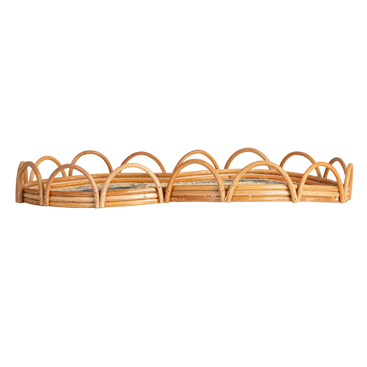 Decorative Rattan & Bamboo Scalloped Tray w/ Printed Florals