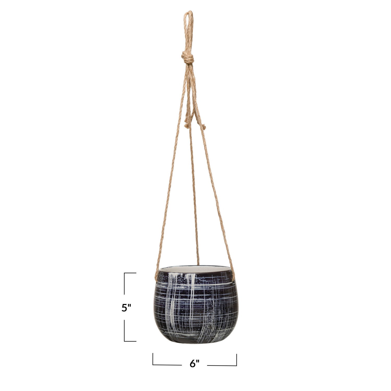 Catalog Name: 6" Round x 5"H Hanging Stoneware Planter w/ Pattern & Jute Hanger, Blue (Holds 5" Pot)