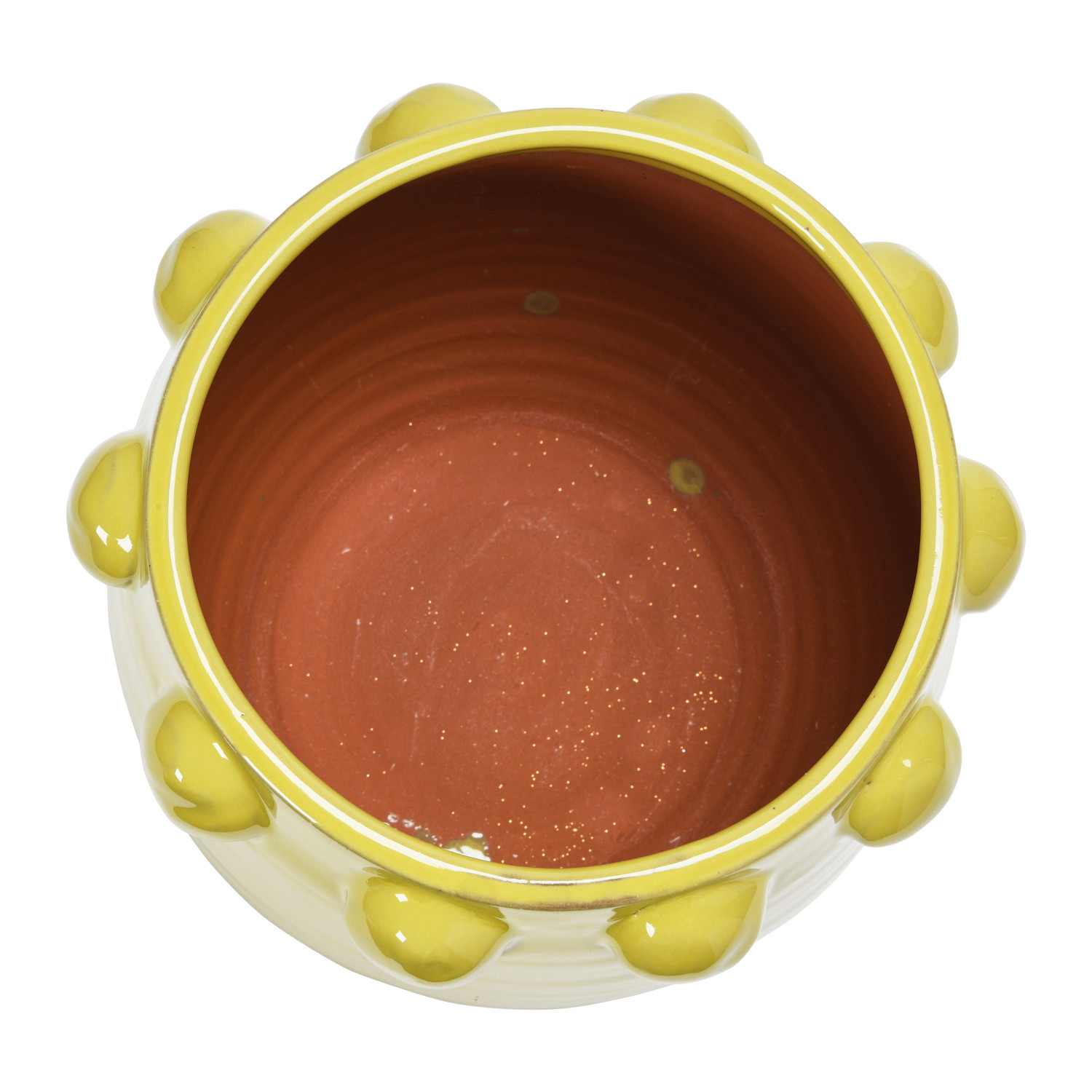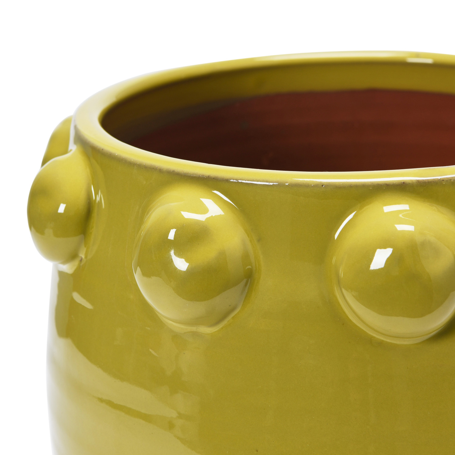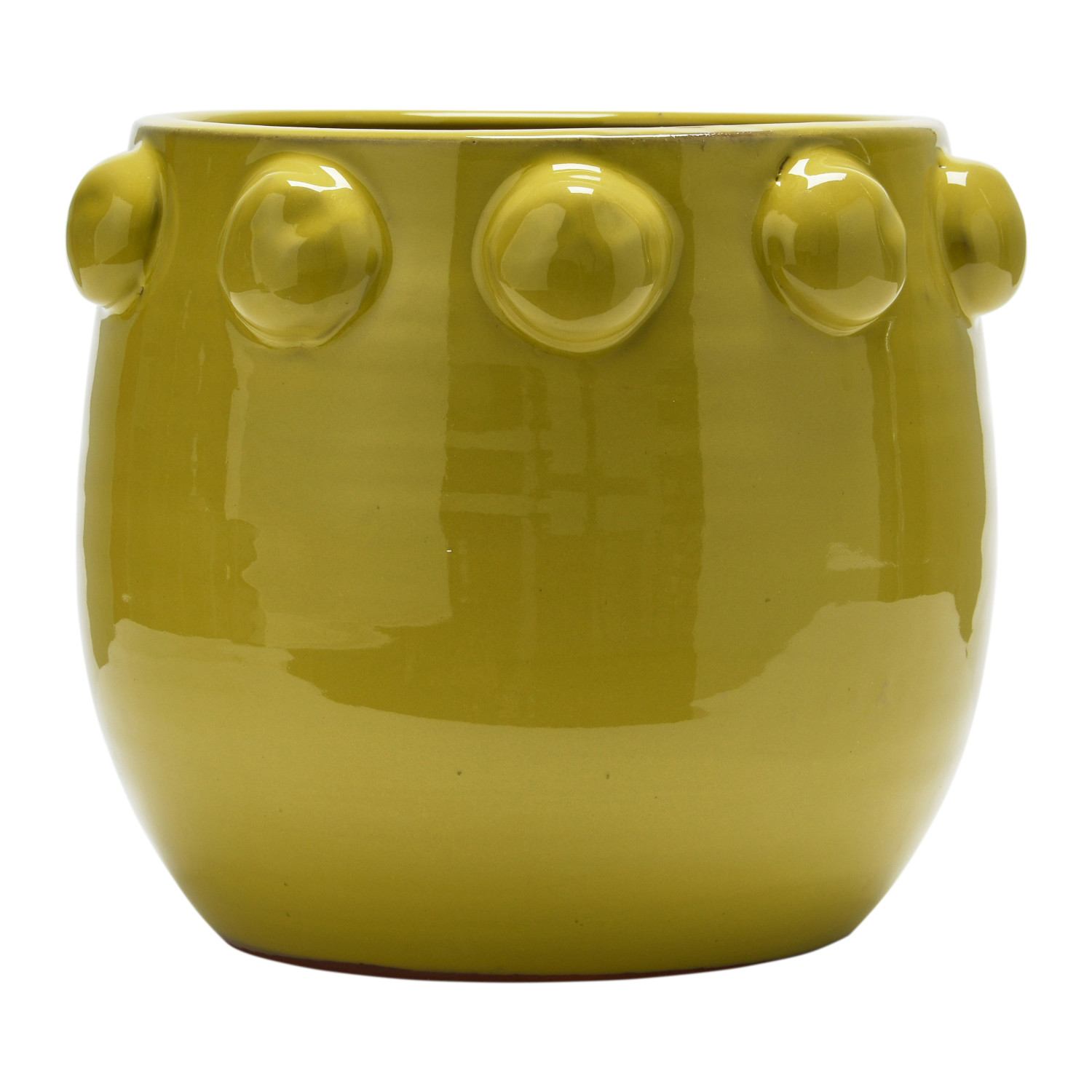 A vibrant and eye-catching terra-cotta planter that has raised dots all over the surface and a chartreuse color. This planter is suitable for any tropical, bohemian, or eclectic style home décor. The planter does not have a drainage hole, so it is recommended to use a liner or a pot inside it to protect it from water damage. Made of terra-cotta.