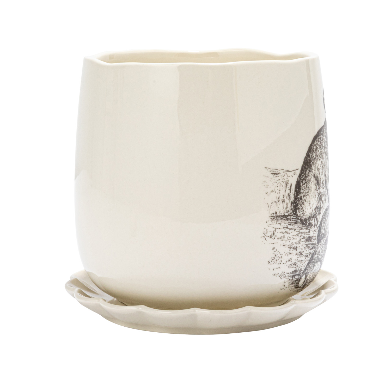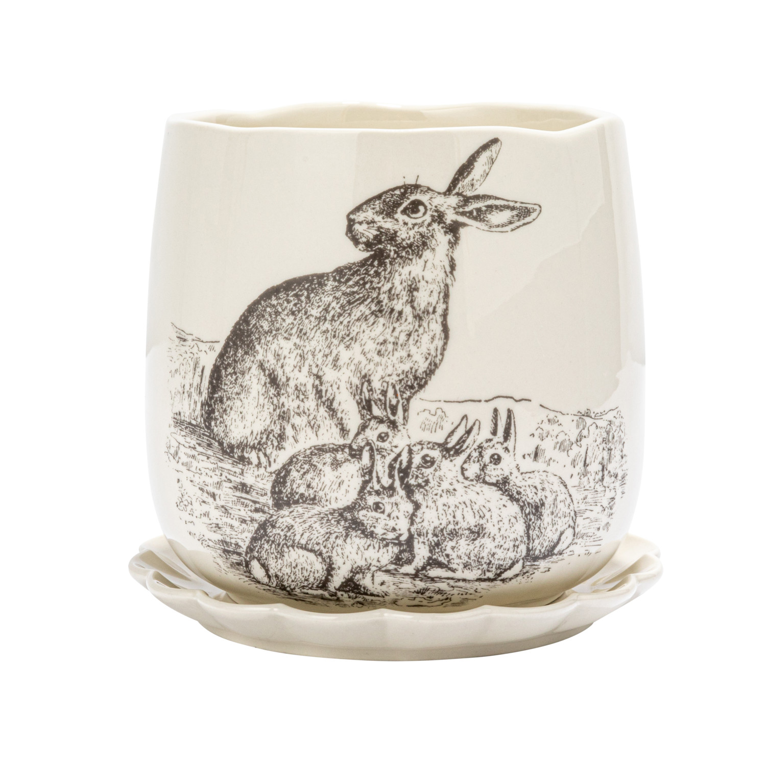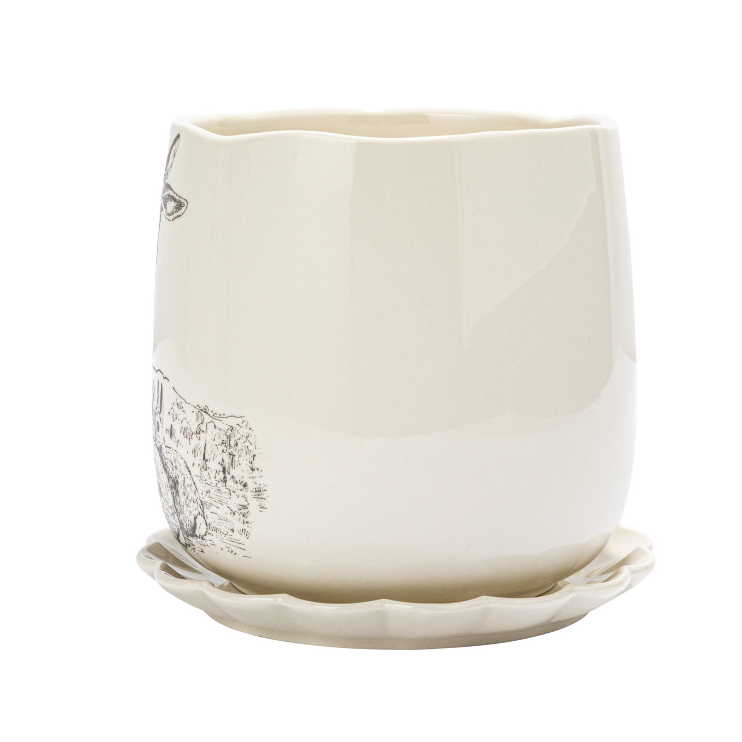 Stoneware Planter w/ Rabbits & Scalloped Saucer, Set of 2 (Holds 5" Pot)