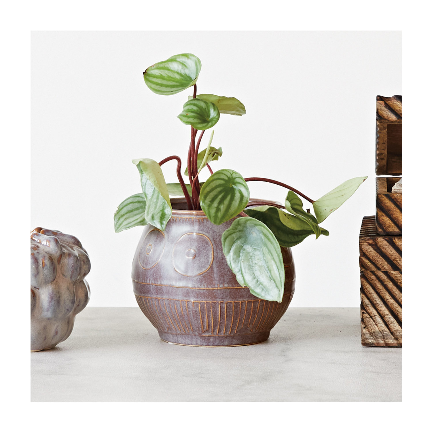 Add some charm and color to the space with this Debossed Stoneware Planter with Pattern, Reactive Glaze, Plum Color. This beautiful planter is made of high-quality stoneware that has a debossed pattern that creates a textured and dimensional look. The reactive glaze finish gives it a glossy and smooth surface that reflects light. The plum color adds a touch of warmth and elegance to the planter. It has a round shape that can hold a 5-inch pot. Use it to display plants or flowers indoors or outdoors. It measures 6.5 inches in diameter and 13.25 inches in height, making it a statement piece for any space. Each planter is unique and will vary slightly in color and pattern. Whether create a farmhouse, garden, coastal, cabin, or cottagecore vibe in the space, this planter will achieve it. It is not only functional but also decorative. It will make the space stand out and impress the guests.