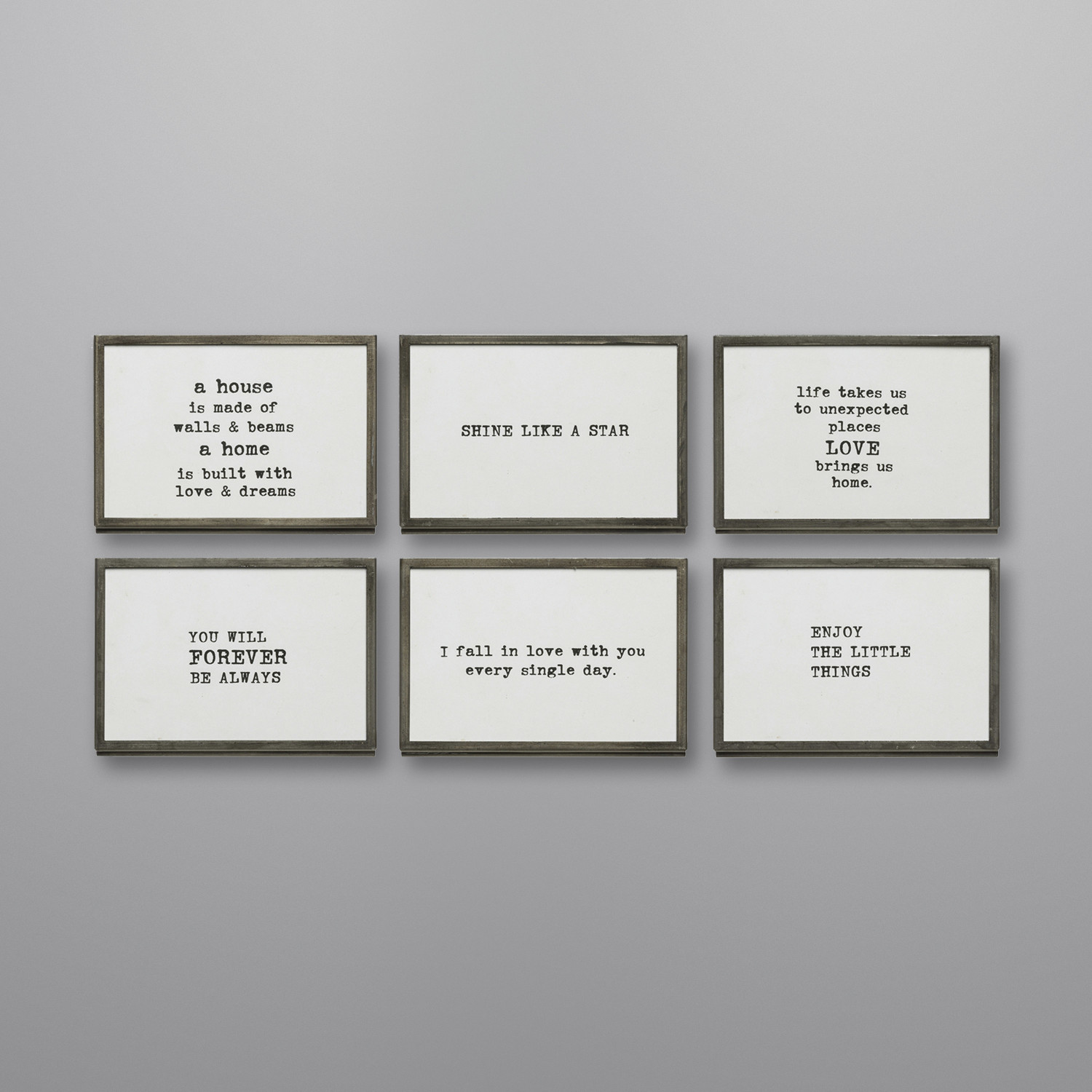 Six metal frames each hold a different phrase to be enjoyed. If desired, the phrases can be replaced with precious photos of family and friends. To create a unique setting, keep the three favorite phrases and place photos in the other three. Mix them together on a tabletop for an enjoyable combination of media.