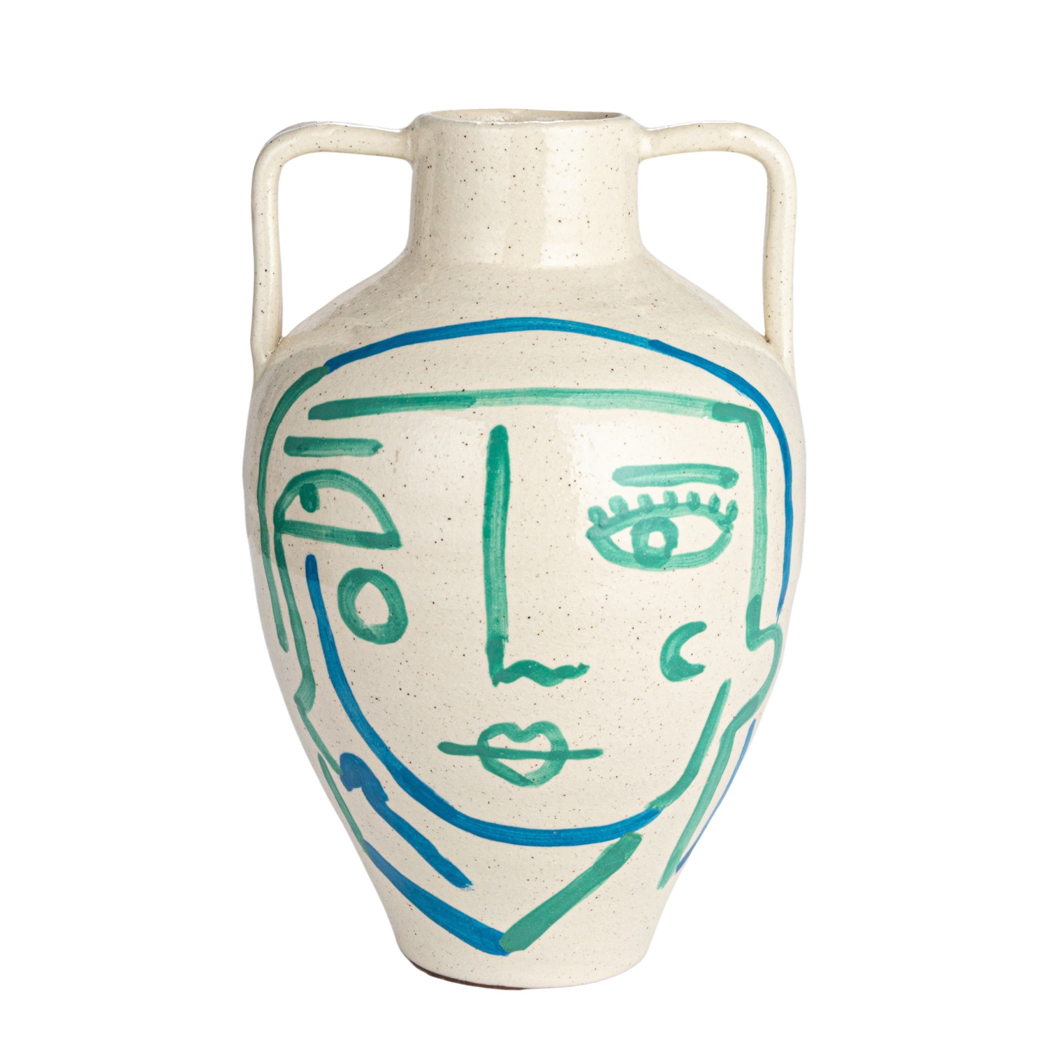 This hand-painted terra-cotta vase features an abstract face and crackle glaze in white, blue, and aqua colors. It is a unique and beautiful home accessory, made of baked clay with a porous and earthy texture. The vase has a round shape and wide opening, and its hand-painted design adds a playful and artistic touch. The crackle glaze creates a glossy surface, while the white, blue, and aqua color scheme adds a cozy and elegant look. This vase can be used to display fresh or artificial flowers, plants, or branches, or as a sculptural accent. Place it on tables, shelves, mantels, or windowsills, and create a cozy and inviting atmosphere in the home. It is suitable for farmhouse, coastal, French country, cottagecore, or boho style and adds personality and charm to any space. Truck shipping is required due to its size and weight.