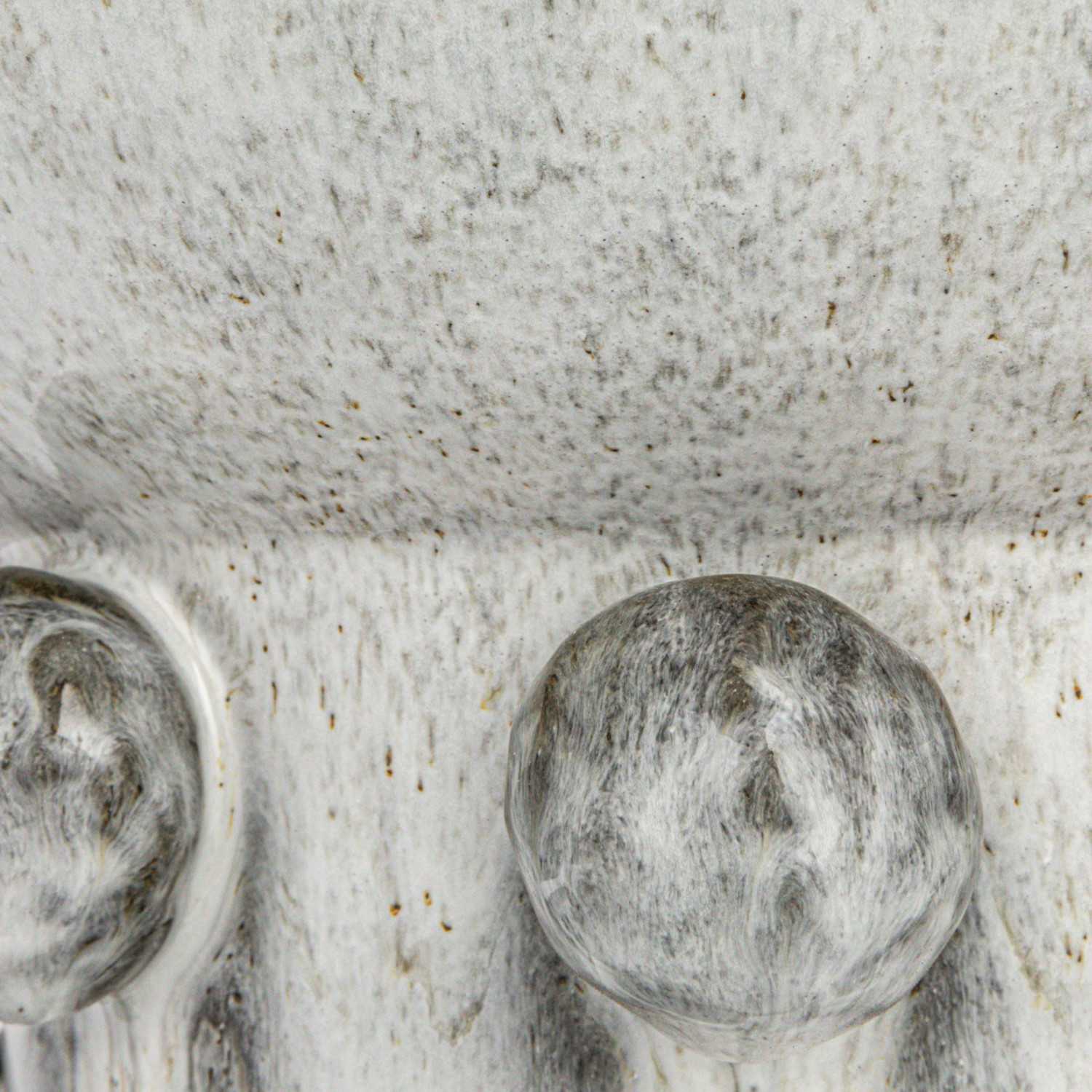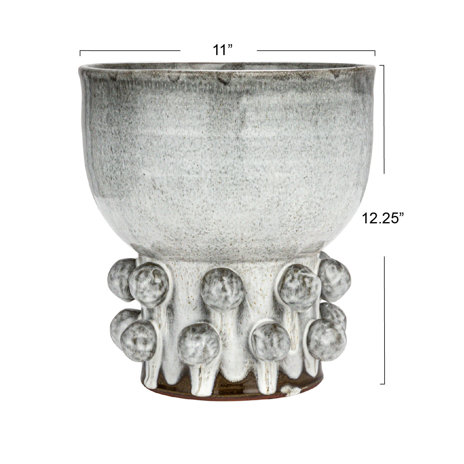 This terra-cotta footed vase with raised dots, white, reactive glaze is a unique and beautiful addition to any home decor. It features a round shape, a glossy finish, and raised dots for dimension. This vase is also ideal for any coastal, beach, farmhouse, French country, or Scandinavian-themed decor, as it adds a touch of texture and elegance. This vase is also perfect for displaying fresh or dried flowers, branches, or greenery, as it creates a stunning and natural look. It is made of terra-cotta, a type of clay that is durable and easy to clean. This vase measures 11 inches in diameter and 12.25 inches in height. This vase is a great gift for anyone.
