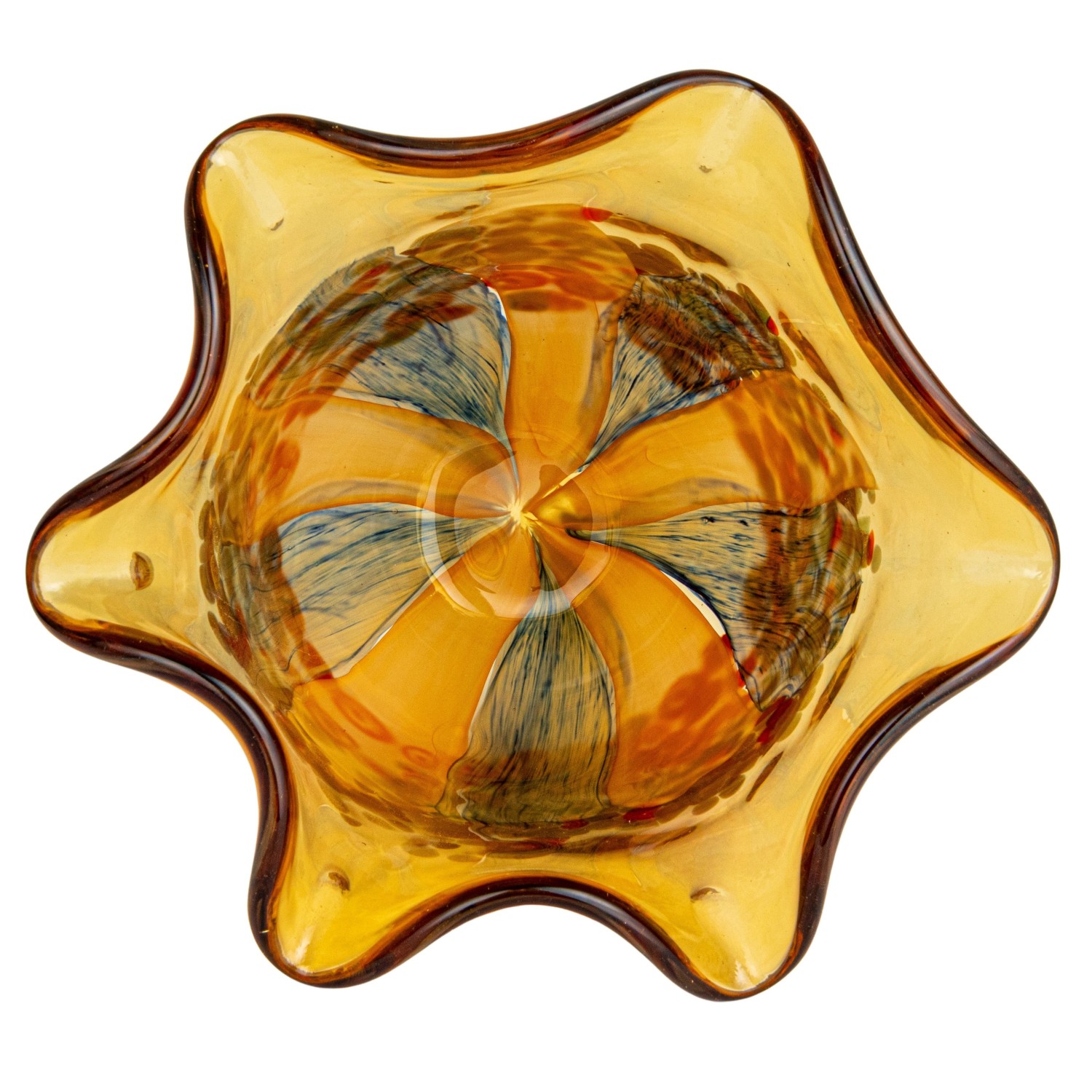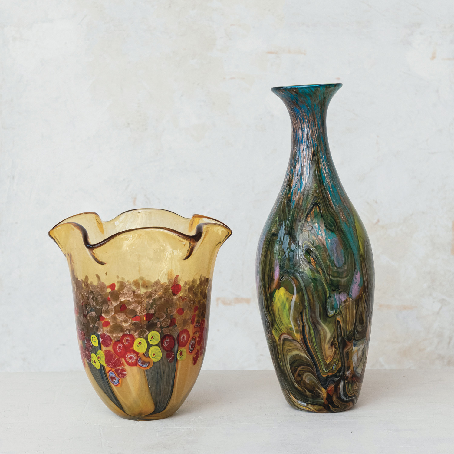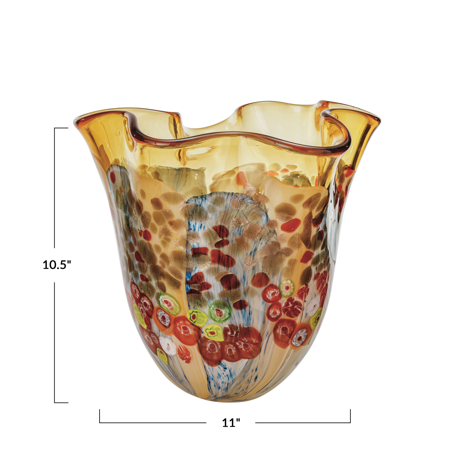 This Handmade Art Glass Vase is a celebration of creativity and craftsmanship. The gold glitter intertwined with the multi-colored abstract dots creates a dynamic and textured effect, reminiscent of a painter's palette. The vase's round shape and ruffled wide opening invite a modern twist on traditional glassware, making it a standout piece. It's designed to capture the essence of the bohemian spirit, the simplicity of Scandinavian design, and the rustic charm of the French countryside. It measures 11 inches in diameter and 10.5 inches in height, offering a generous space for creative floral arrangements. Whether used to hold a vibrant array of flowers or as a decorative object, this vase is sure to enchant and inspire.