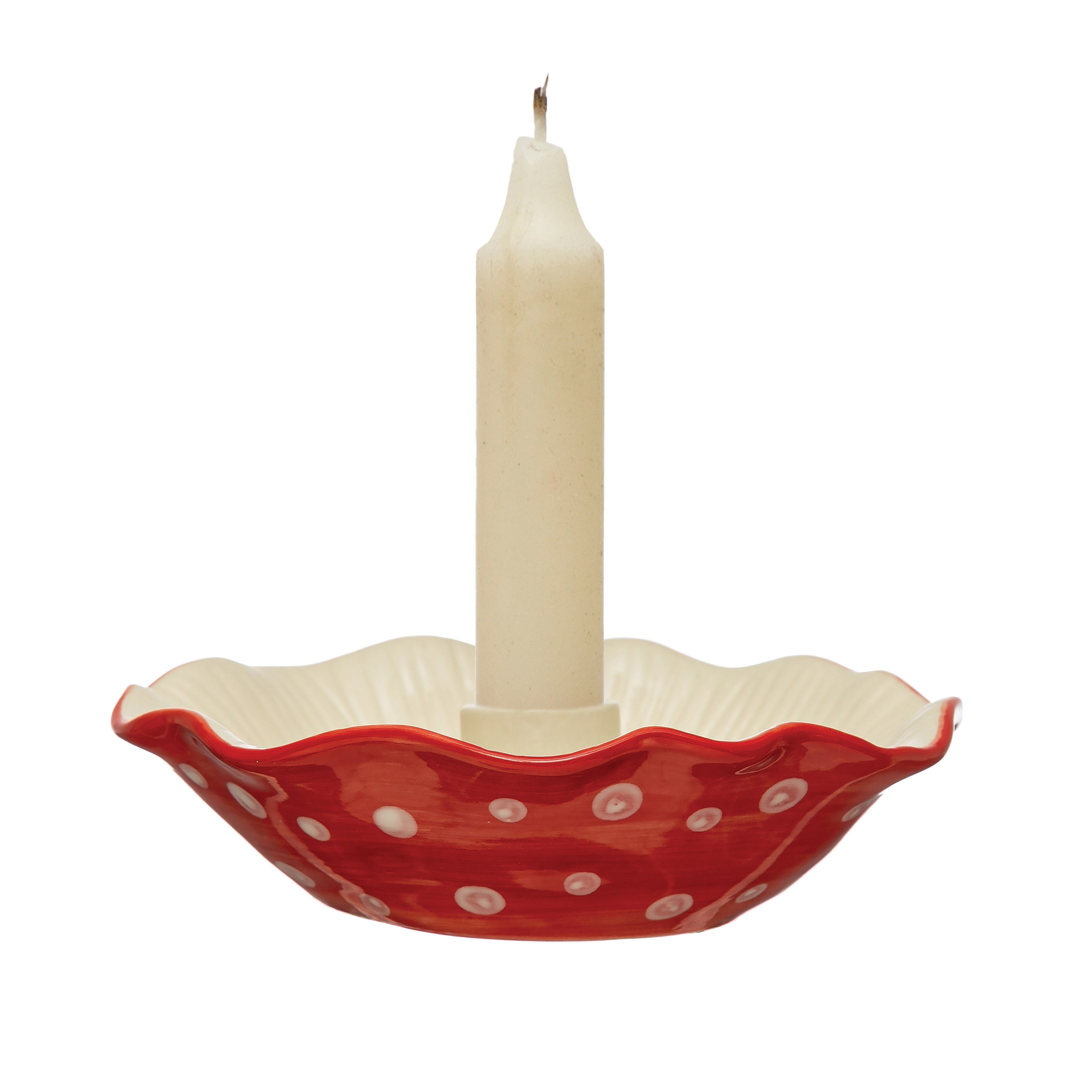 Catalog Name: 5-1/2" Round x 1-1/2"H Hand-Painted Stoneware Mushroom Taper Holder, Red and Cream Color