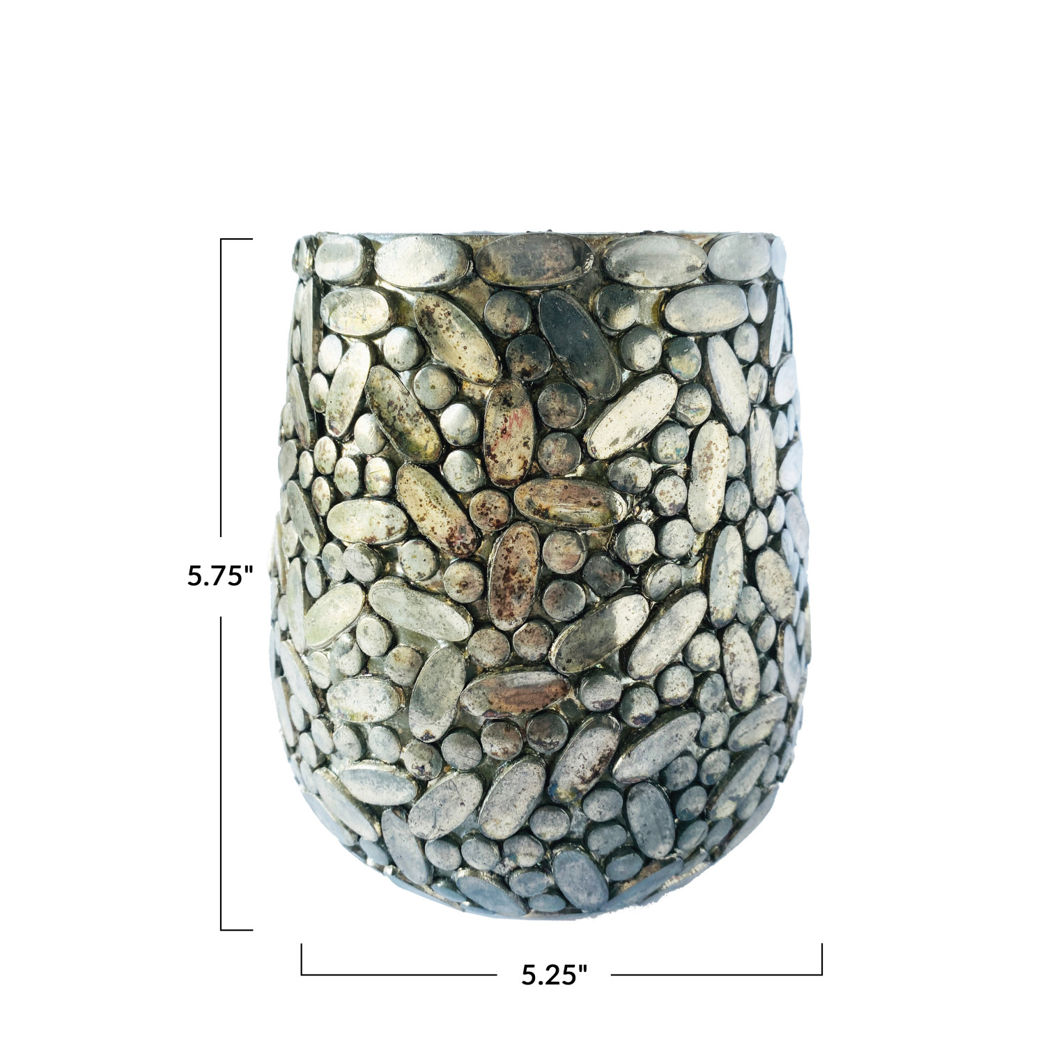 Catalog Name: 5-1/4" Round x 5-3/4"H Recycled Glass Mosaic Votive Holder, Oxidized Pewter Finish