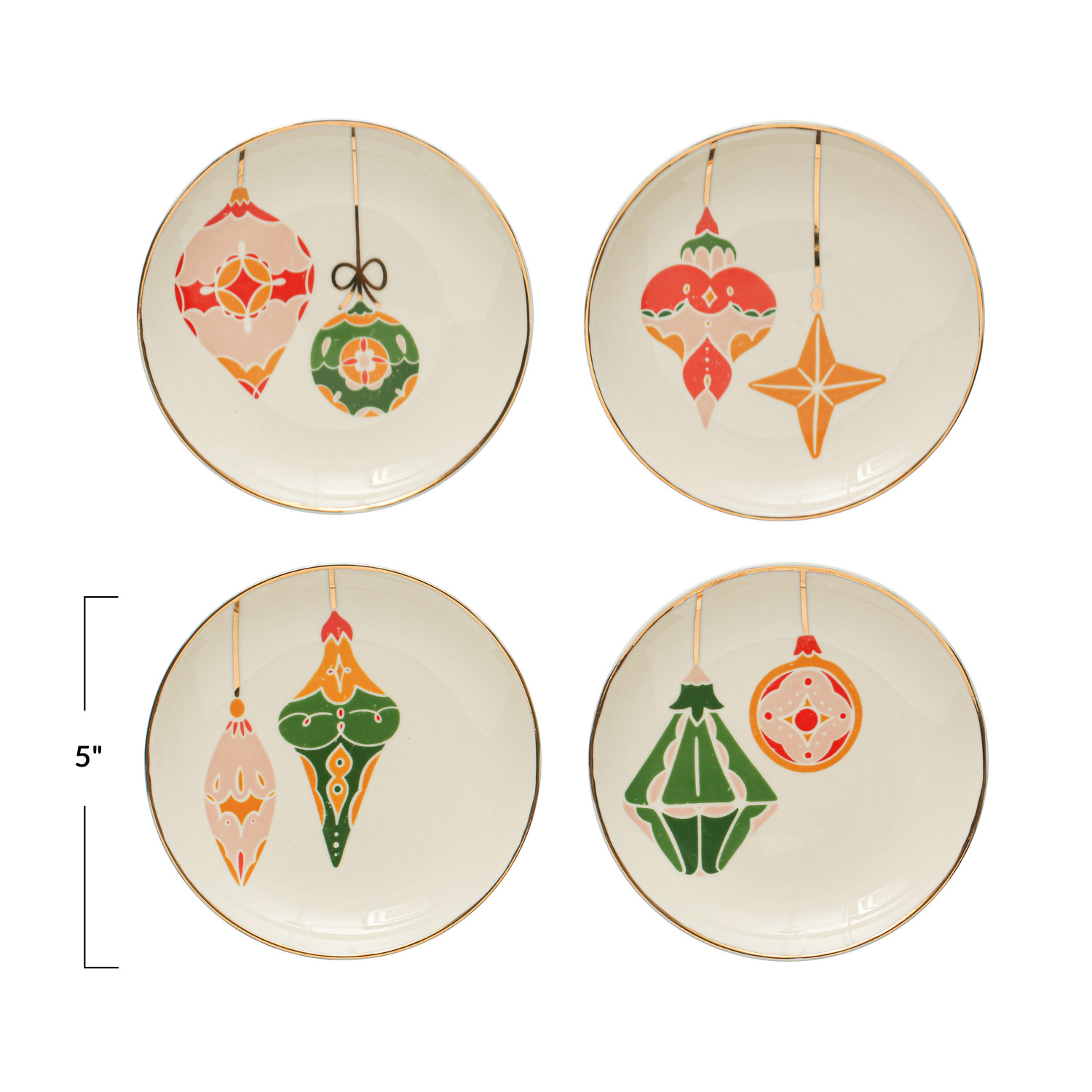 5" Round Stoneware Plate w/ Ornaments & Gold Electroplating, 4 Styles