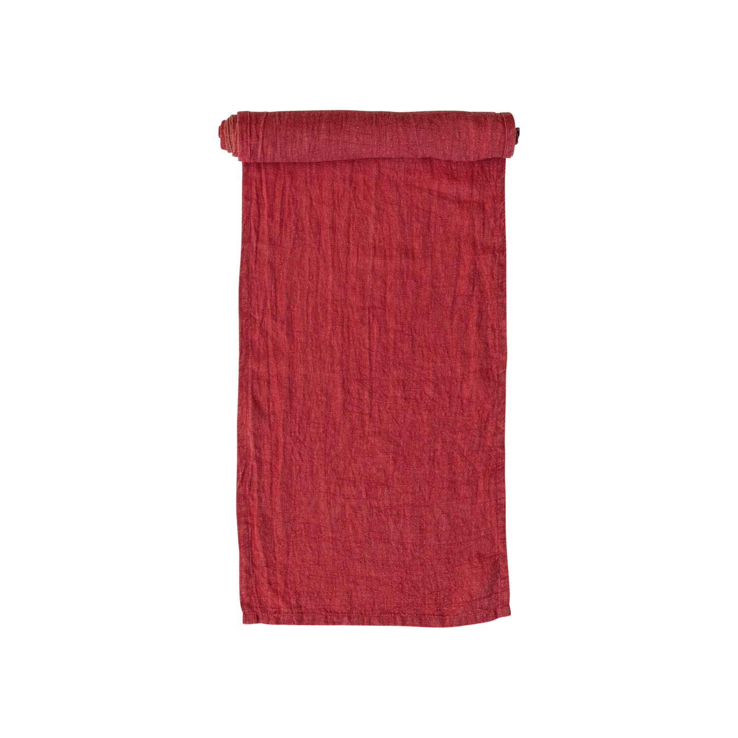 Add some warmth and coziness to the table with this stonewashed linen table runner in red. This table runner is a simple and elegant piece that features a rich red color and a natural texture that adds some character and charm to any space. The table runner is perfect for any season, whether it is a Valentine's Day dinner, a Fourth of July barbecue, a Thanksgiving feast, or a Christmas party. The table runner is made of linen, which makes it soft, smooth, durable, and easy to care for. The table runner measures 108 inches in length and 14 inches in width, making it a great fit for most tables. Transform any table into a stylish display with this versatile and functional table runner. A stonewashed linen table runner with a rich red color and a natural texture that adds some warmth and coziness to the table. A simple and elegant piece that can enhance any table setting, from classic to modern, casual to formal. This table runner is perfect for any occasion, whether it is a casual family meal, a festive holiday celebration, or a special event.