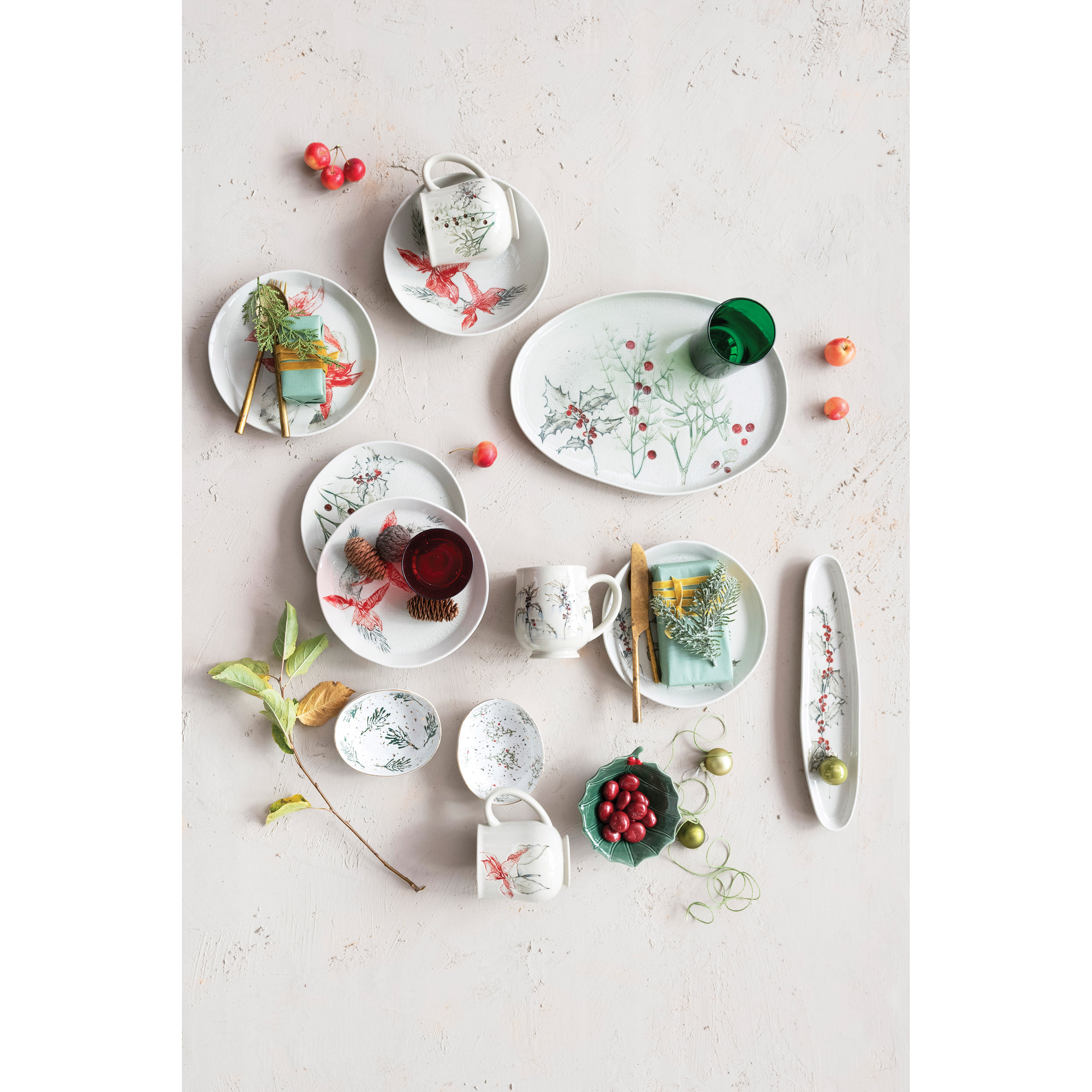Oval Debossed Stoneware Tray with Holly, Reactive Crackle Glaze