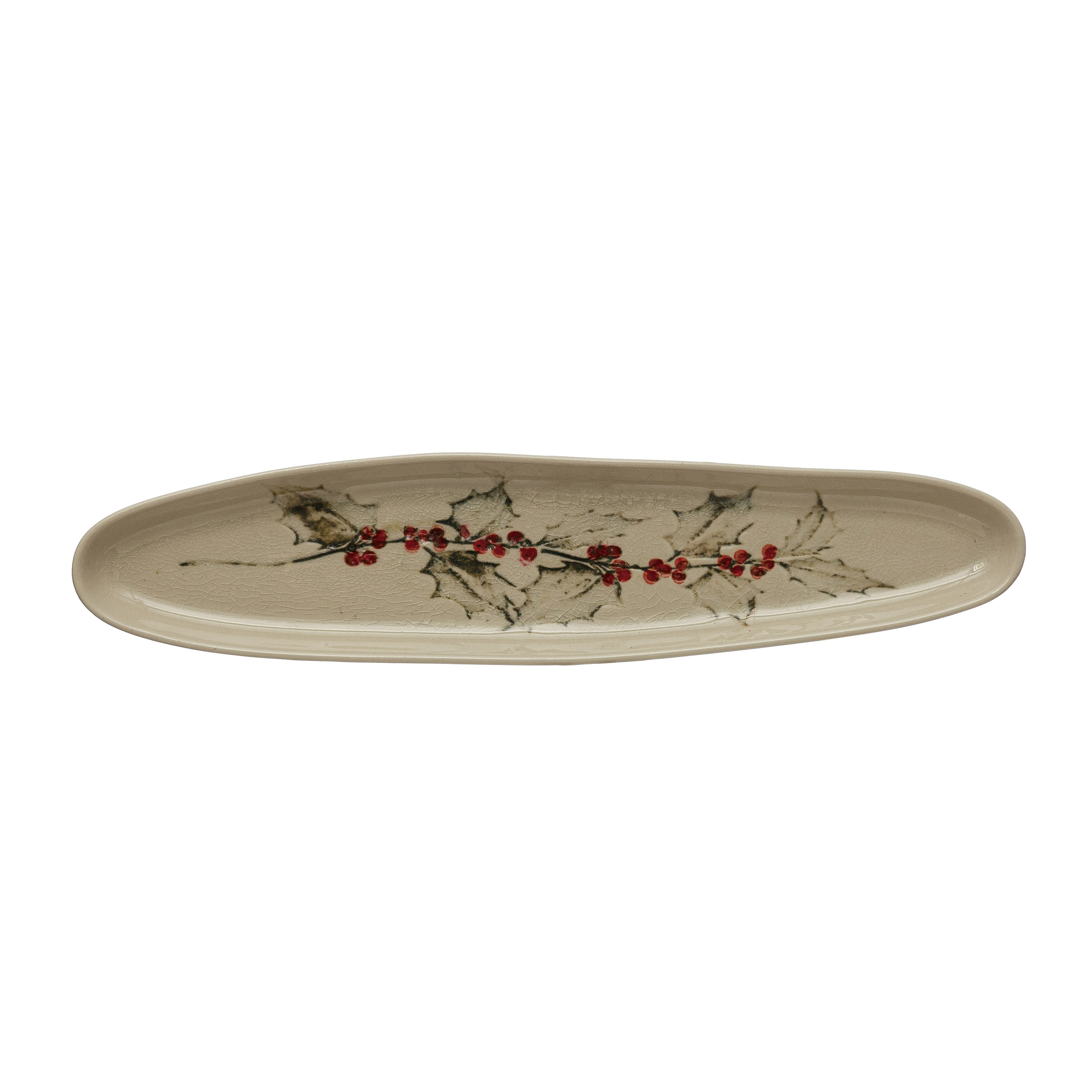 Catalog Name: 13-3/4"L x 2-3/4"W Oval Debossed Stoneware Tray w/ Holly, Reactive Crackle Glaze, Multi Color (Each One Will Vary)
