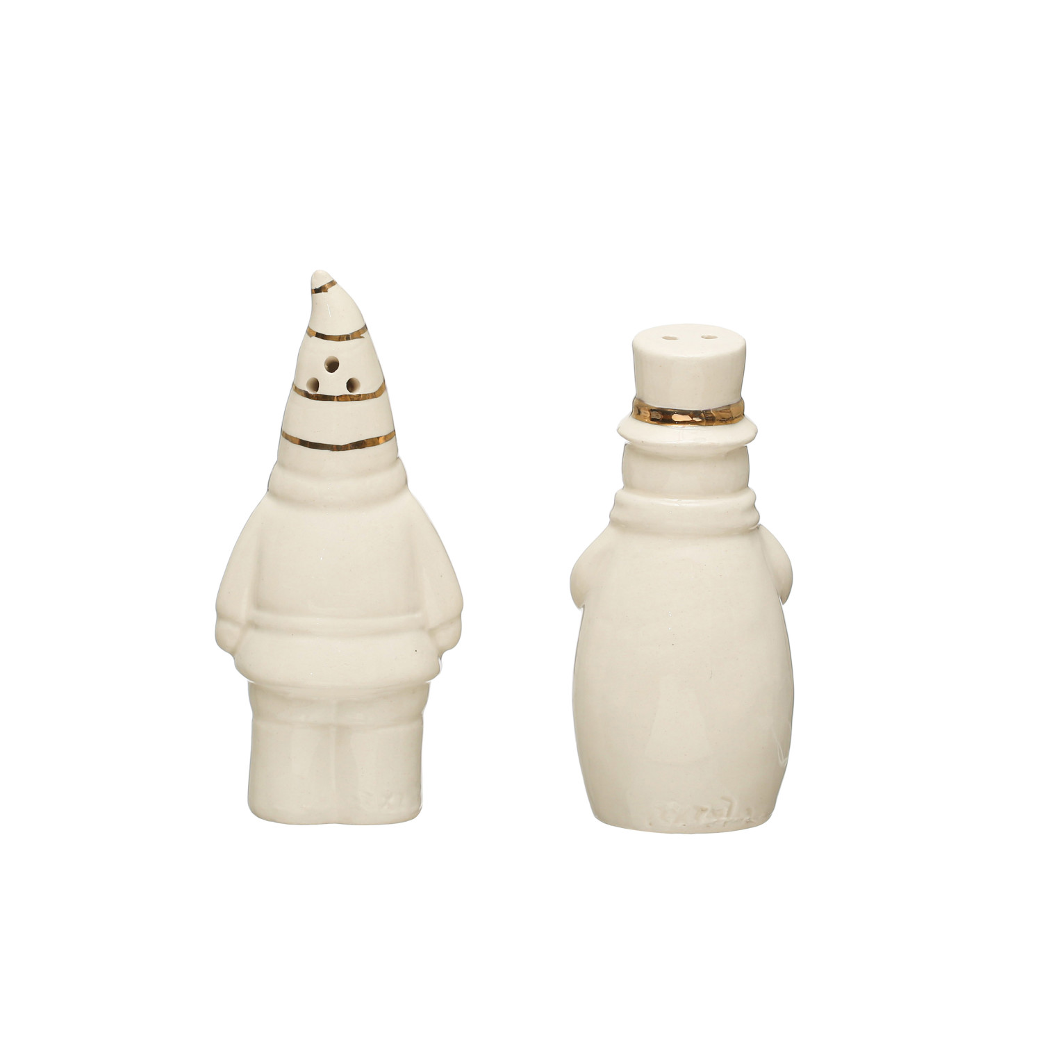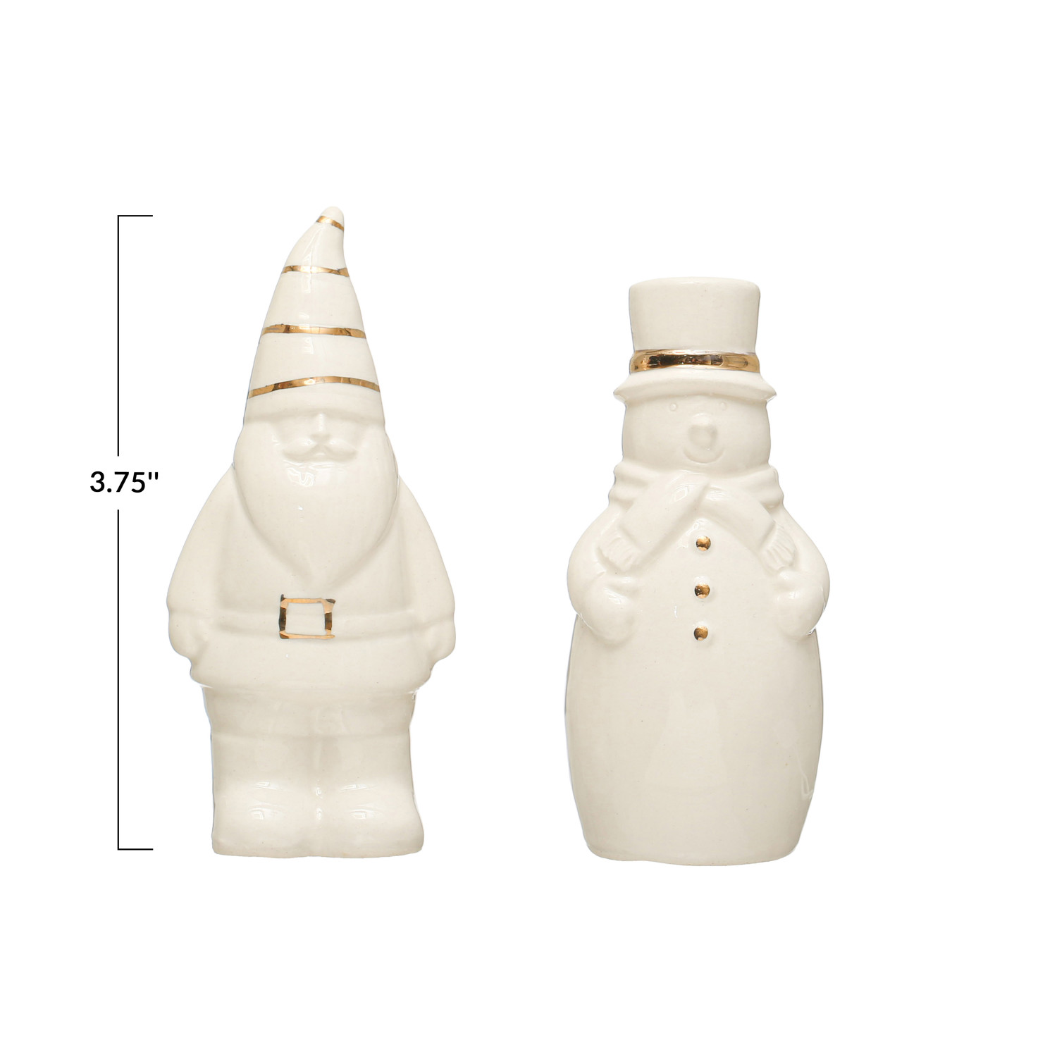 Catalog Name: 3-3/4"H Stoneware Santa & Snowman Salt & Pepper Shakers w/ Gold Electroplating, White, Set of 2 ©