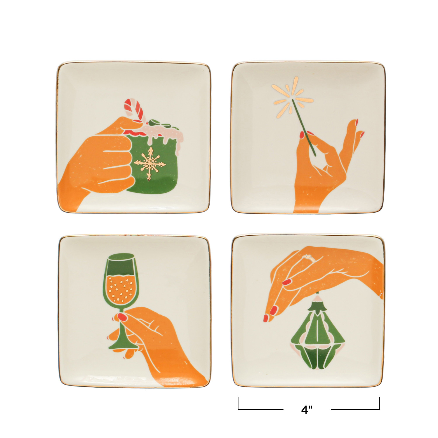 Catalog Name: 4" Square Stoneware Dish w/ Gold Electroplating, Hand & Ornament/Beverage, Multi Color, 4 Styles