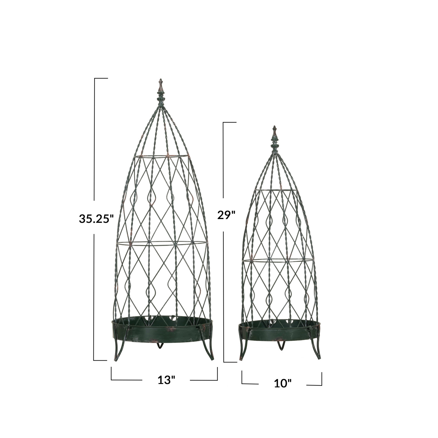 Catalog Name: 13" Round x 35-1/4"H & 10" Round x 29"H Metal Wire Garden Obelisk w/ Plant Tray, Distressed Green, Set of 2