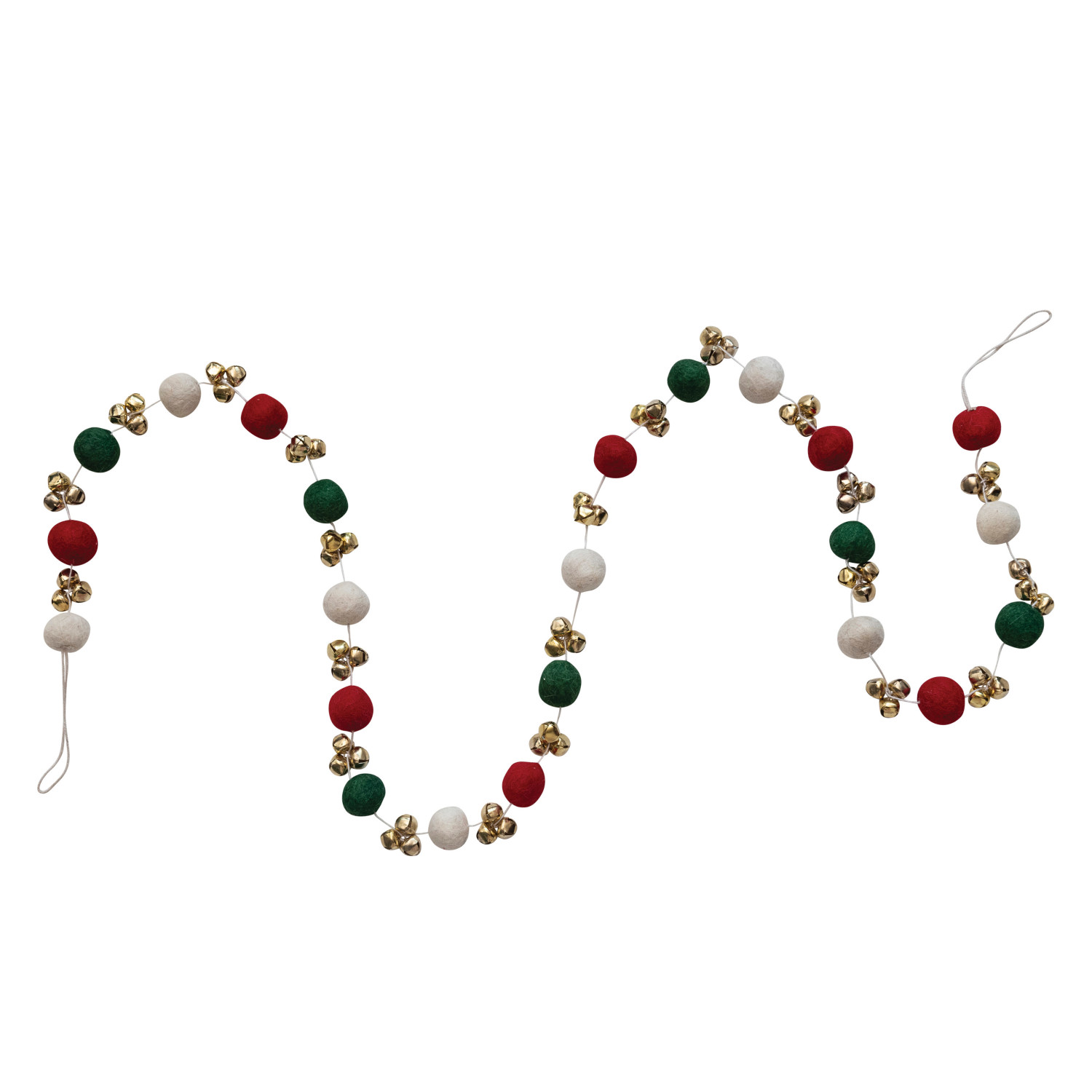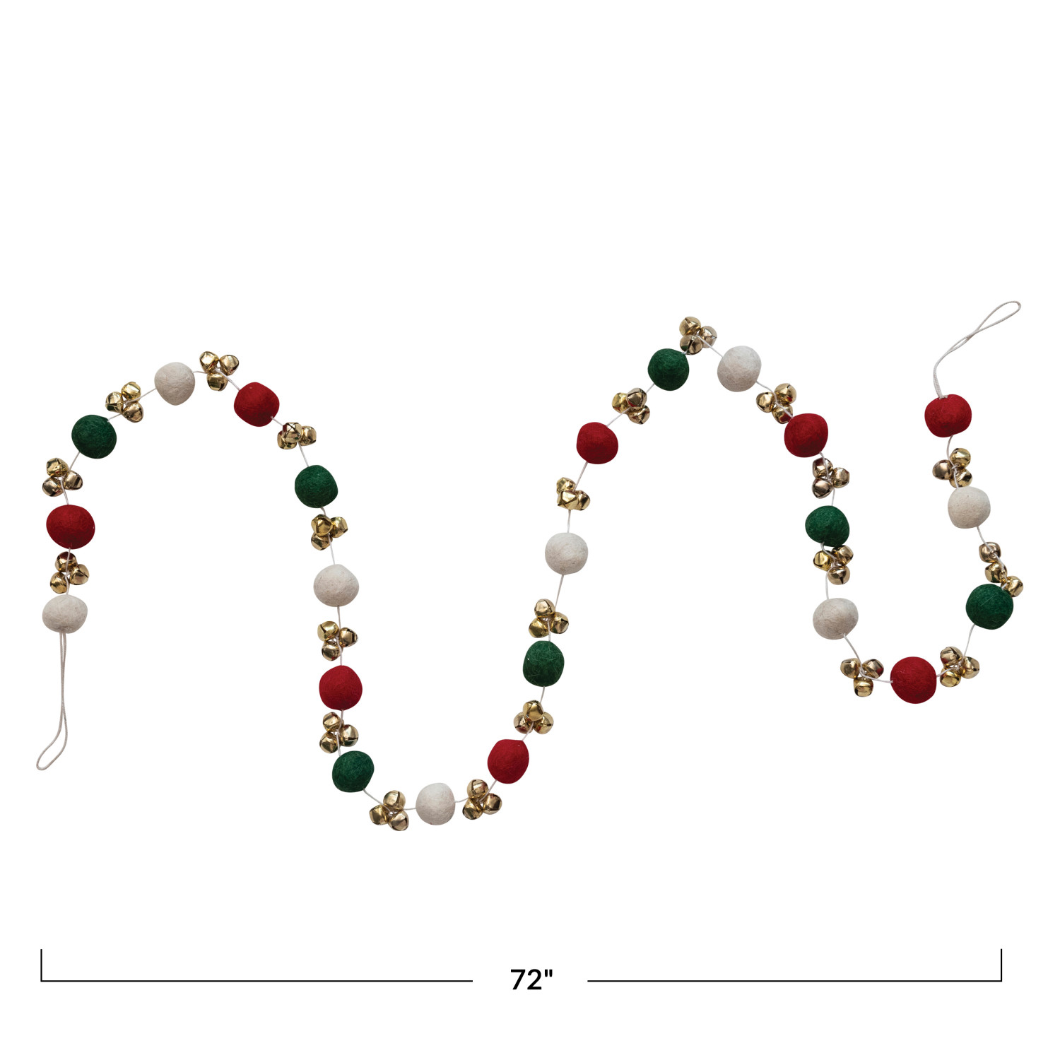 Catalog Name: 72"L Handmade Wool Felt Ball Garland w/ Jingle Bells, Red, Green, Cream Color & Gold Finish