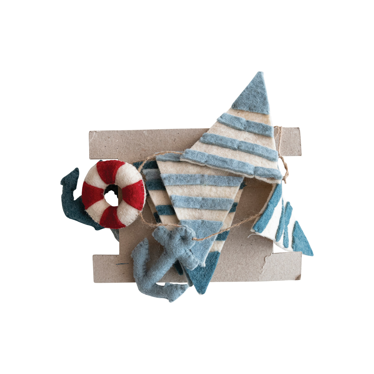 This handmade wool felt pennant garland captures the essence of nautical adventure with its colorful anchors and life buoys. Each element is meticulously crafted, bringing a sense of the high seas to the home. The garland stretches 72 inches long and stands 5 inches high, making it a substantial decorative statement that's still easy to hang and enjoy. Whether looking to add a touch of maritime charm to the living space or seeking the perfect accessory for a sea-themed event, this garland is sure to delight with its quality craftsmanship and joyful design. It's a piece that will anchor the decor in style and fun. A vibrant handmade wool felt pennant garland, adorned with anchors and life buoys, evoking the spirit of the sea. An ideal decorative piece for those who love the ocean, this garland adds a splash of nautical whimsy to any room. Ideal for enhancing a beach-themed party, a child's nautical room, or as a charming touch to a coastal retreat.