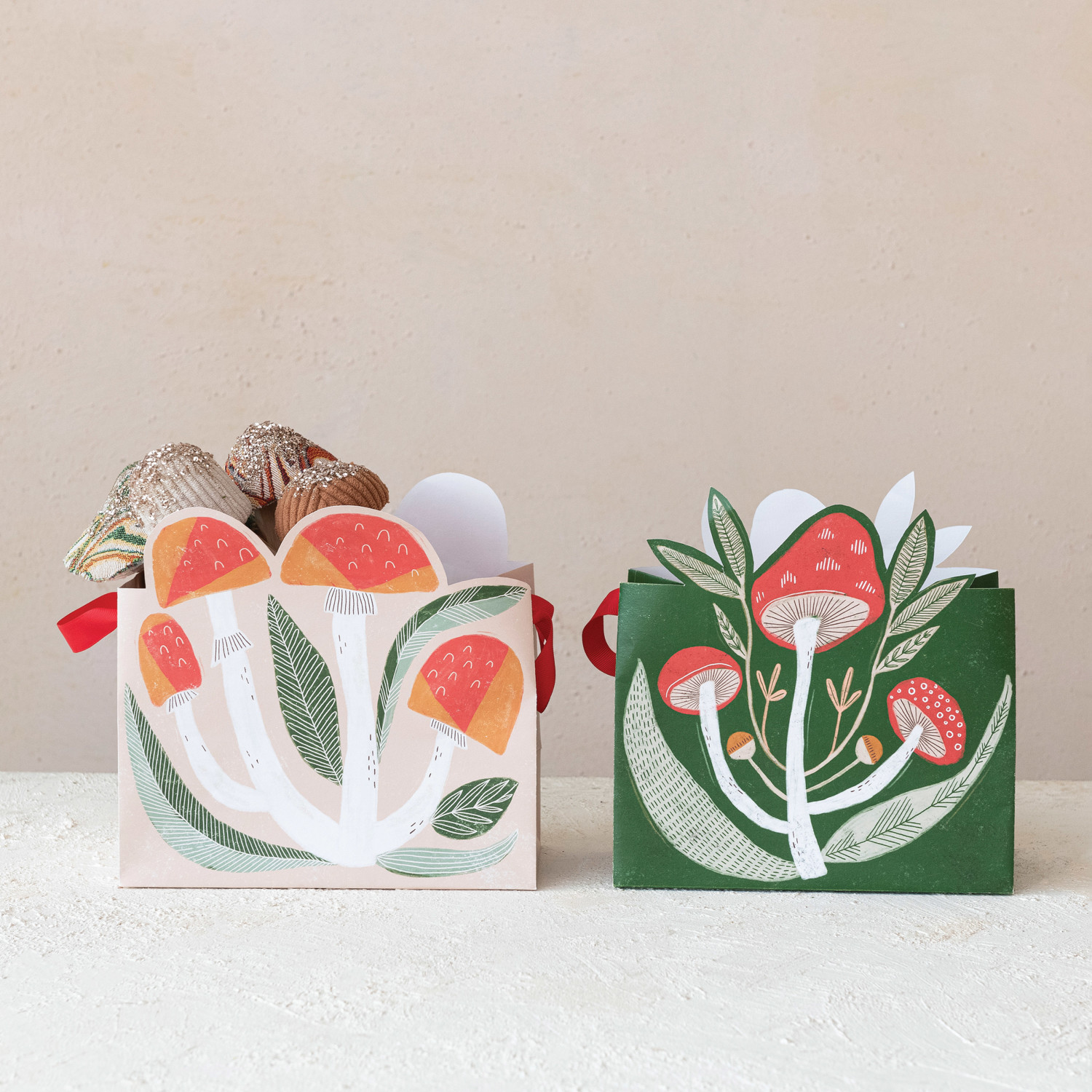 Catalog Name: 9"L x 4-1/2"W x 8-1/2"H Printed Recycled Paper Mushroom Shaped Gift Bag, Multi Color, Set of 2 ©
