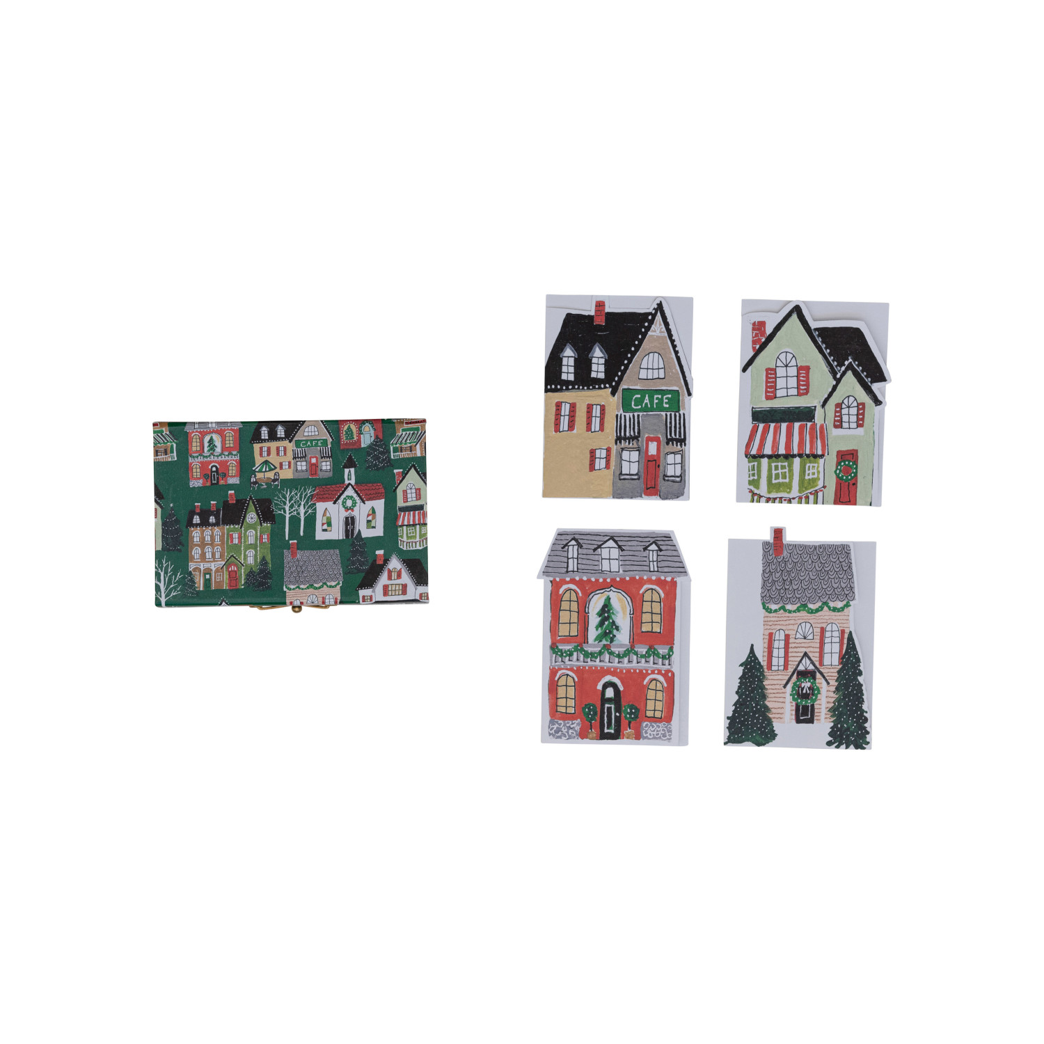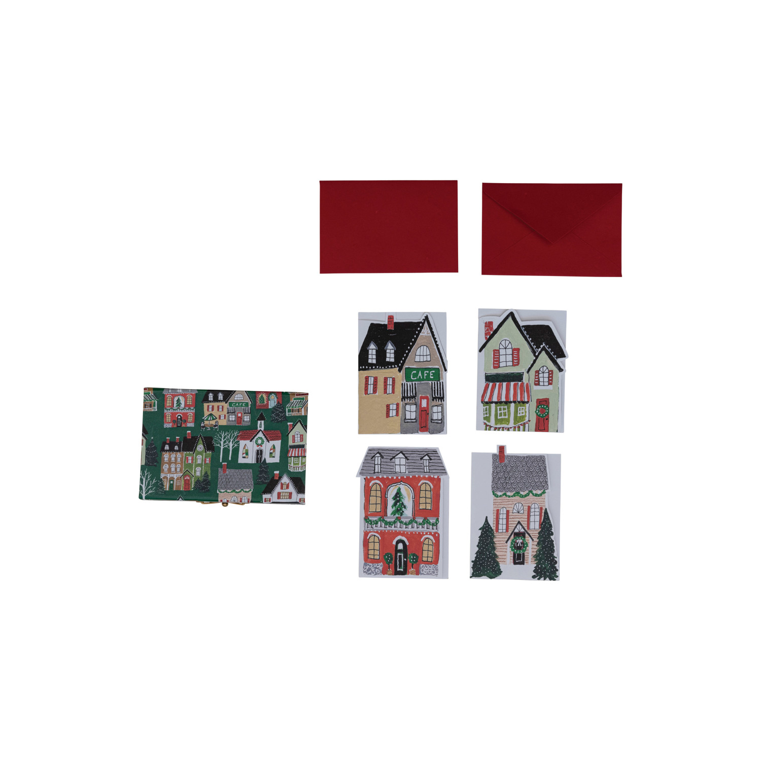 Catalog Name: 4-3/4"L x 6-3/4"H Handmade Printed Recycled Paper Christmas Cards w/ Houses, 6 Red & 6 Pink Envelopes, 4 Styles, Boxed Set of 12 (Blank Inside) ©